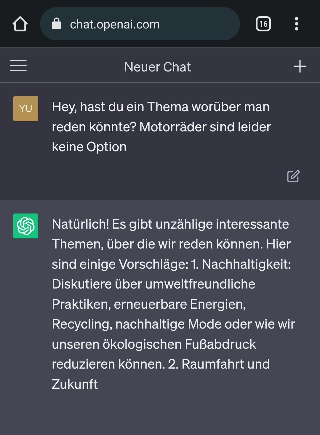 Ich gehe auch schlafen. Nicht wegen den Fragen, sondern eif weil ich Ultra müde bin, und morgen nd vom Motorrad fallen will…