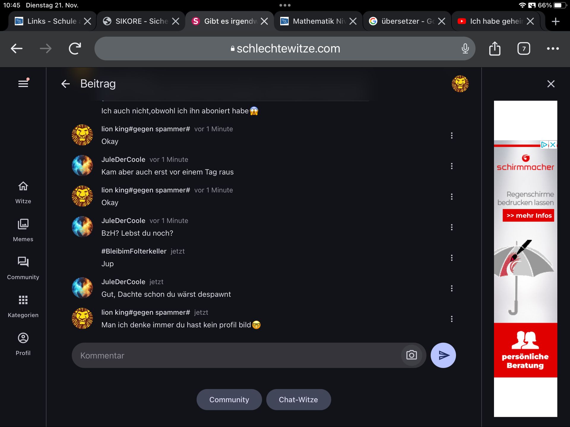 Ich war auf Seite 437 oder so in der Community und dann bin ich ausversehen wieder auf Community button gekommen jz bin ich auf die seite von heute gelandet 😭