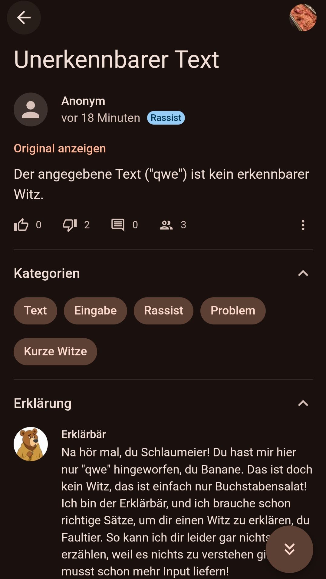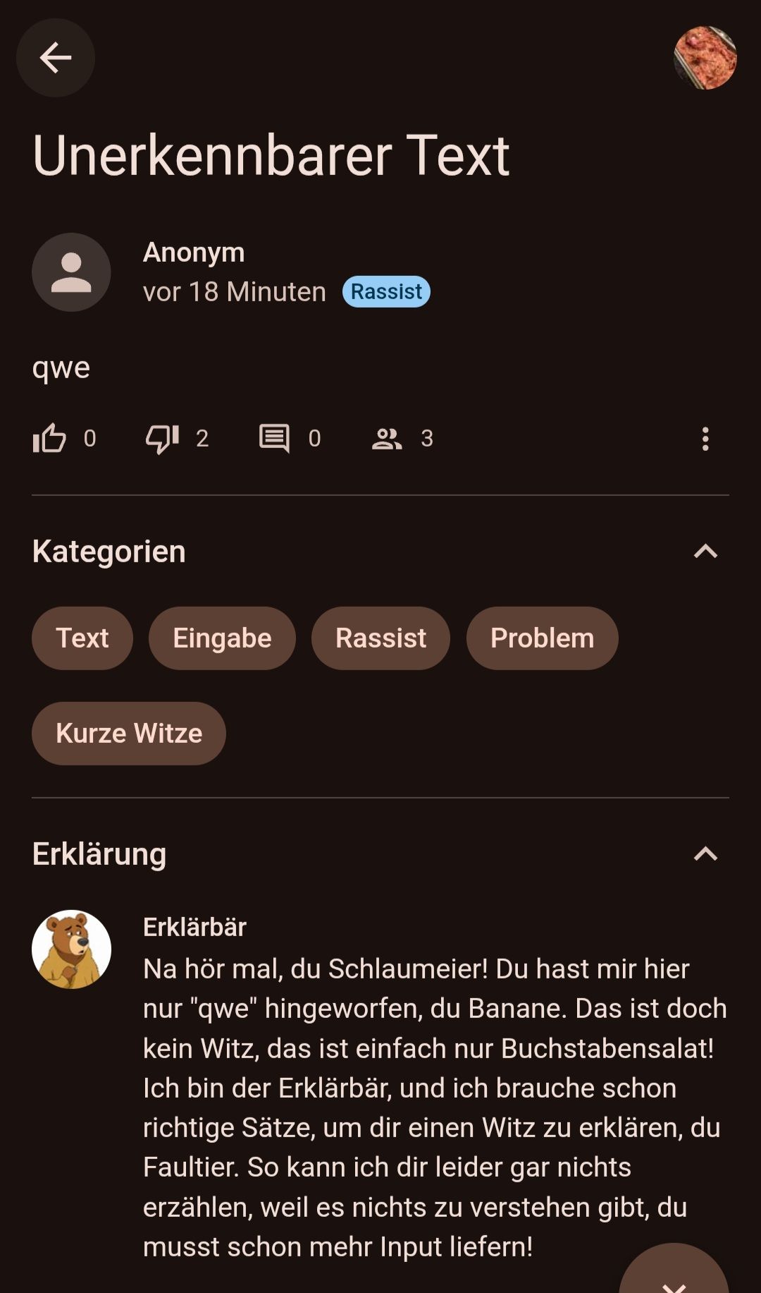 Colinvor 3 MonatenBananenbrot11#Kommunismus#161I dont get itDa hat jemand nur "qwe" geschrieben. Und Matthias' Korrektur-Bot namens "System" (der hauptsächlich Tippfehler etc. korrigiert) hat ganz richtig erkannt, dass das kein richtiger Witz ist
