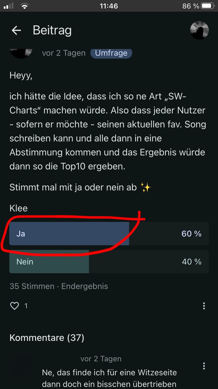 Los geht‘s mit den "SW-Charts"! Es ist mit der Umfrage entschieden, denn 60 % haben für "Ja" gestimmt.