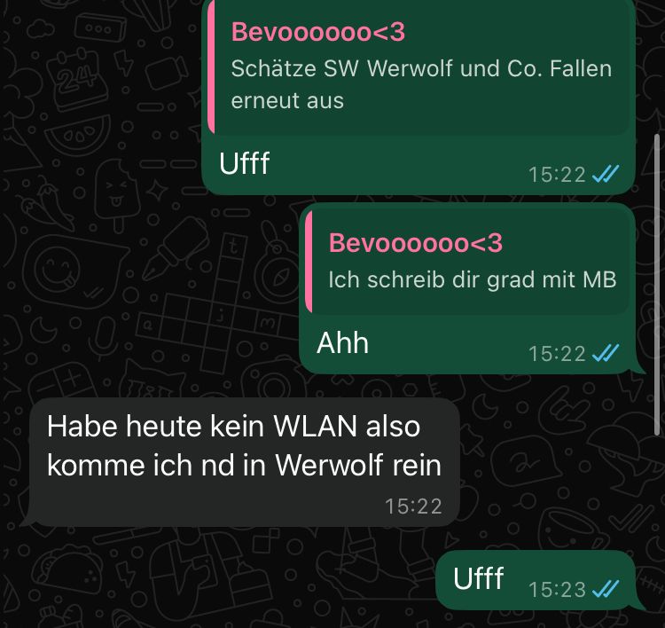 Bei bevo ist der WLAN Router kaputt, sie hat mir halt mit mobile Daten Geschrieben deswegen geht das mit Werwolf heute wohl nicht