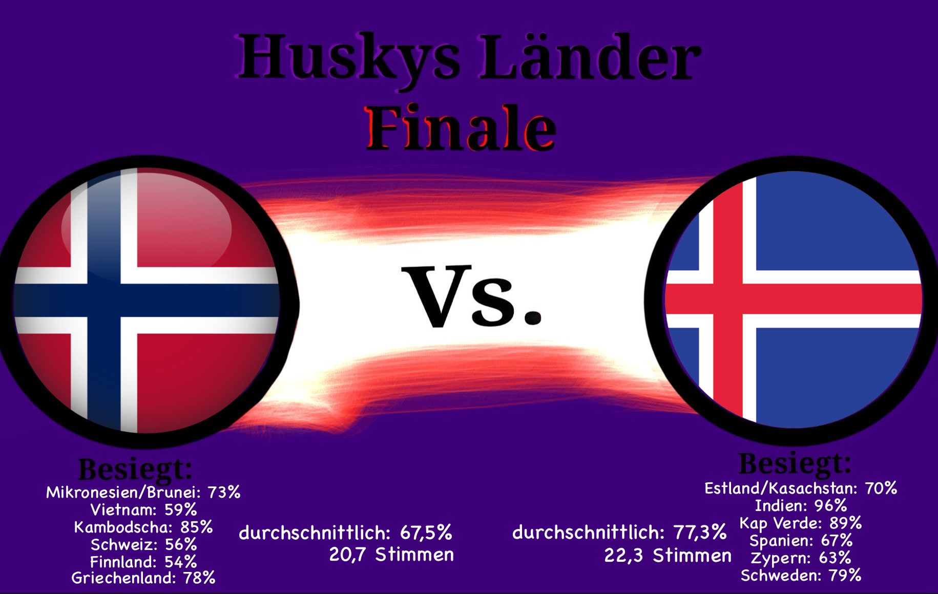 Es war eine lange Reise, einige Überraschungen waren dabei. Doch wie alles hat auch dieses Projekt ein Ende. Es hat mir unglaublich viel Spaß gemacht, und ich danke jedem, der dieses Projekt mit seiner Stimme unterstützt hat. Ich freue mich auf zukünftige Projekte mit euch. Doch nun ist es soweit, das große Finale. Welcher Staat ist das beliebteste Reiseziel? Wird es Norwegen, mit seiner atemberaubenden Schönheit und unberührten Natur? Oder doch Island, das Land aus Feuer und Eis? Viel Spaß, bei der letzten Umfrage dieses Turnieres