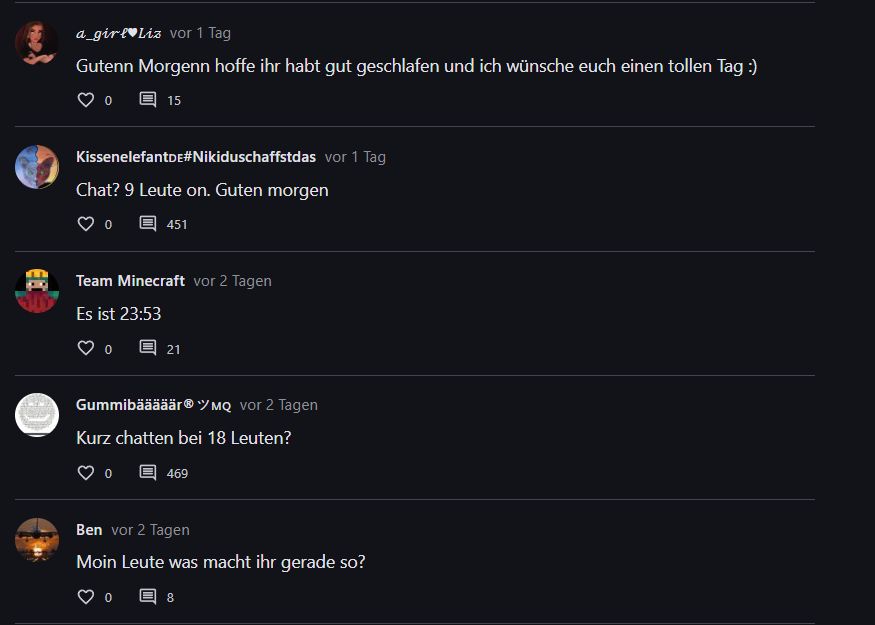 Diese ganzen Beiträge mit "Guten Morgen" oder "Gute Nacht" sind indirekte Chats, ansonsten könnte man das nämlich auch einfach in den zu der Zeit obersten Chat Beitrag rein schreiben, denn da würden ja alle hingehen. Und eben weil neue Chats erstellt werden anstatt in die alten zu gehen entsteht dann wieder ein "Guten Morgen ..." klar es sieht schön aus, solange es sich in Maßen hält. Gleich Mal ein Bild als Beispiel