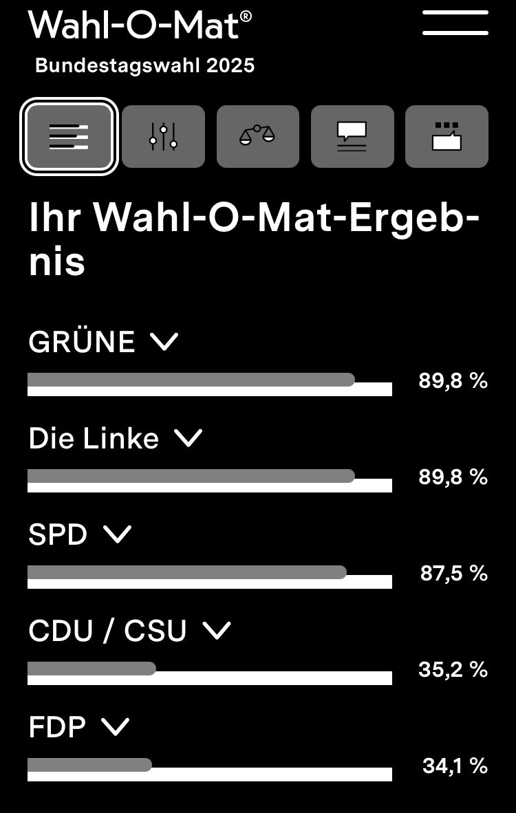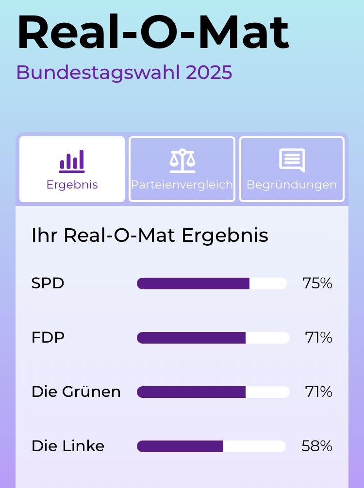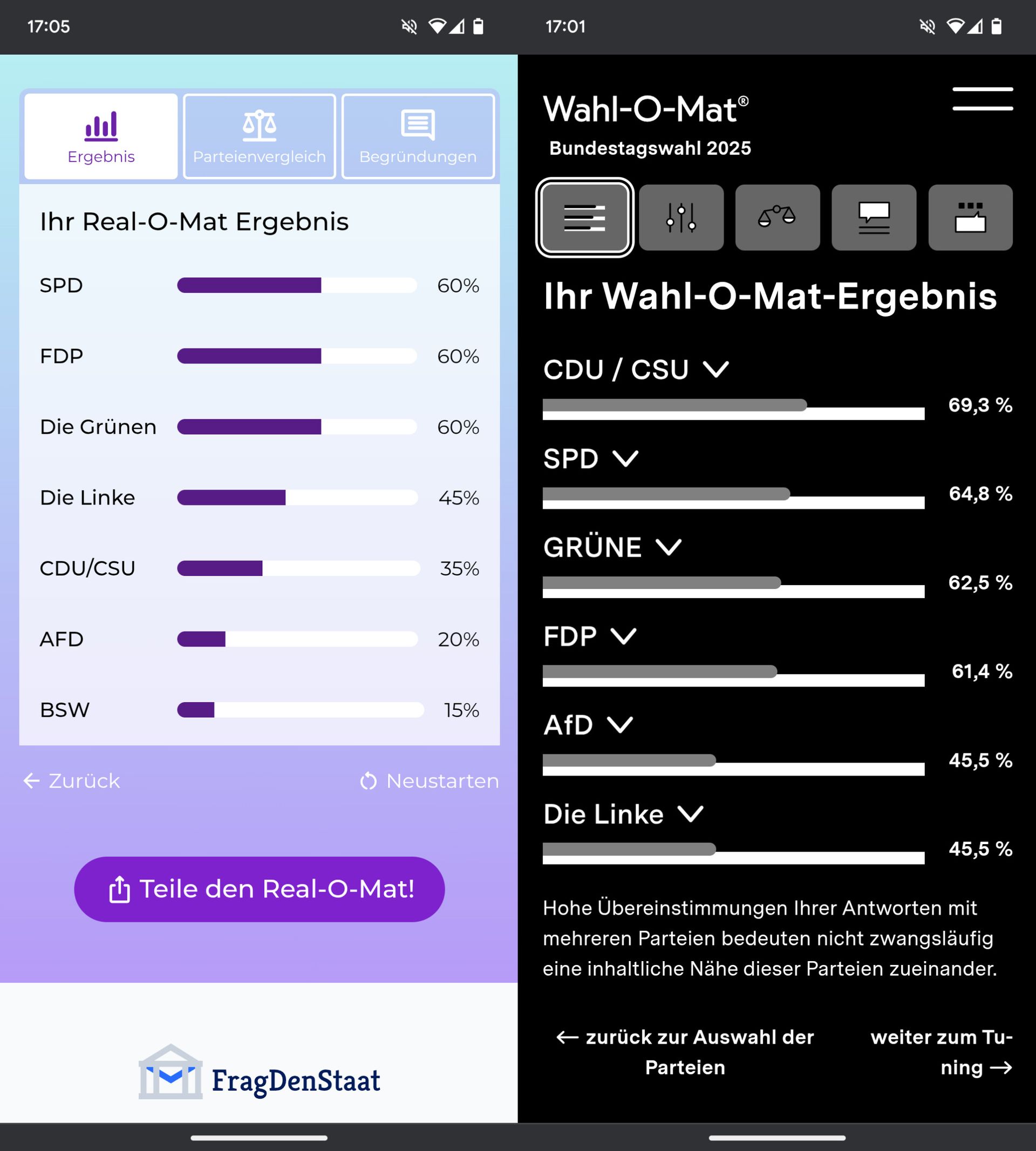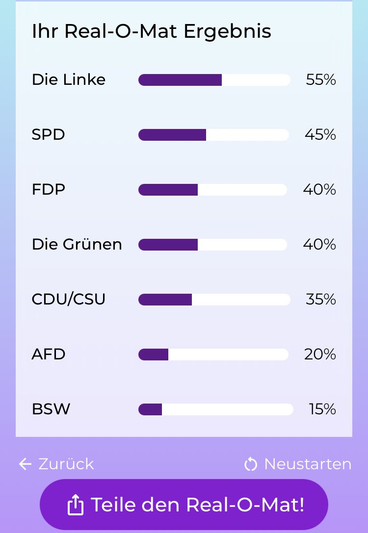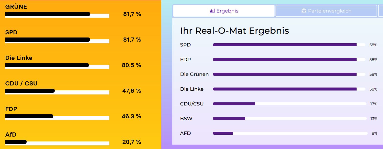 Ich fand die fragen nicht so aussagekräftig und parteideckend beim real o mat. Das waren irgendwie keine richtigen Parteischwerpunkte und auch nicht so viele Fragen (fast nur die hälfte).