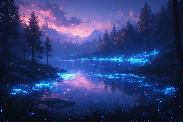 Ich hatte auch an einen dunklen See gedacht, eher so Baggersee-Größe - aber natürlich entstanden, und zwar in einem Nadelwald, der im Sommer oft von Glühwürmchen erhellt wird (wie im Bild). Fluss würde aber auch passen. Zu dem Gewässer gehen die Katzen regelmäßig, um zu fischen. Ihre Krieger sind also nicht nur Jäger, sondern auch Fischer.