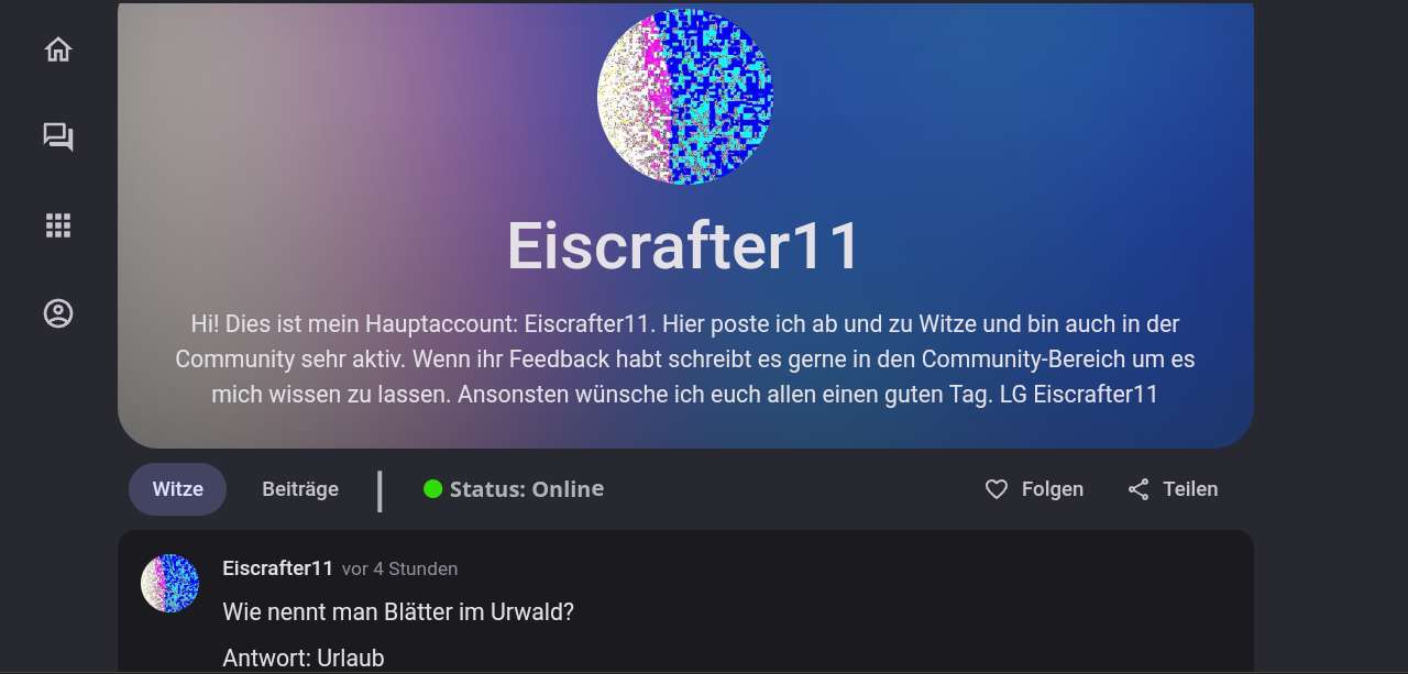Wie wäre es wenn man anhand des Profiles eines angemeldeten Users sehen könnte, ob dieser Online/Offline ist. Dies könnte man in den Einstellungen selbstverständlich an und aus stellen. Was Zweitaccounts angeht hätte ich auch eine Lösung: Man könnte den Zweitaccount als "offiziellen" Zweitaccount registrieren (Dazu müsste man als Bestätigung das dies wirklich der Zweitaccount ist das Passwort des Haupt- und Zweitaccounts eintragen) Design-Vorschläge sind in den Kommentaren. LG Eiscrafter11
