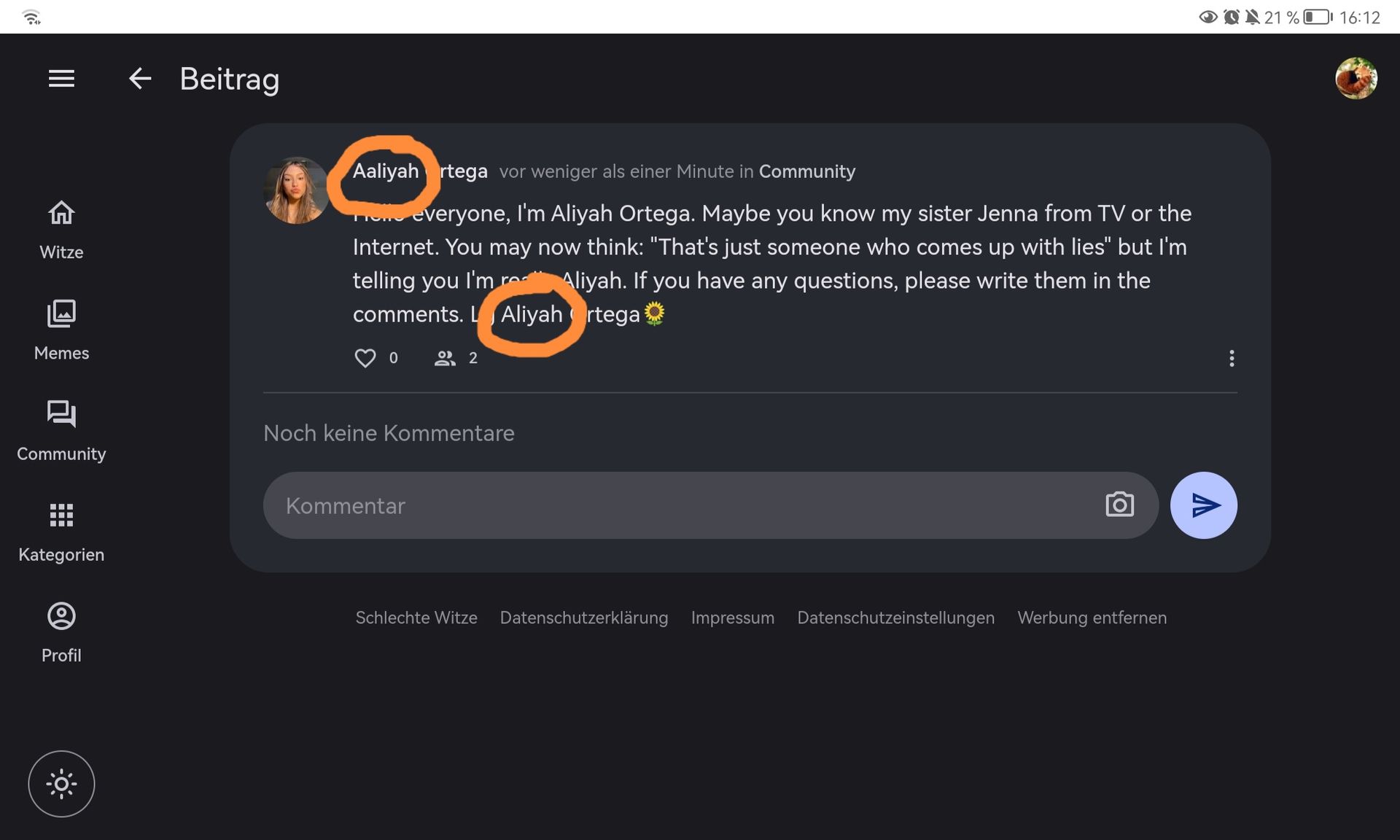 Wenn du wirklich Aliyah Ortega bist, dann mach doch selbst ein Foto von dir, und nimm keins aus dem Internet.