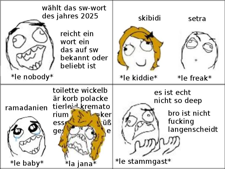 Willkommen beim SW Wort 2025!🎆🎇 Es ist eine Abstimmung die so ähnlich ist wie das Jugendwort des Jahres. In diesem Fall geht es um Worte die hier auf SW sehr beliebt oder bekannt sind. Es funktioniert folgendermaßen: Ihr könnt in diesem Beitrag bis zum 3.1. Vorschläge für das SW Wort des Jahres in diesem Beitrag einreichen. Anschließend werden diese Worte in einem 2. Beitrag als Umfrage zur Abstimmung gestellt. Dort entscheidet sich dann was SW Wort des Jahres wird. Ich hoffe euch gefällt dieses neue Format! Viel Spaß beim SW Wort des Jahres!