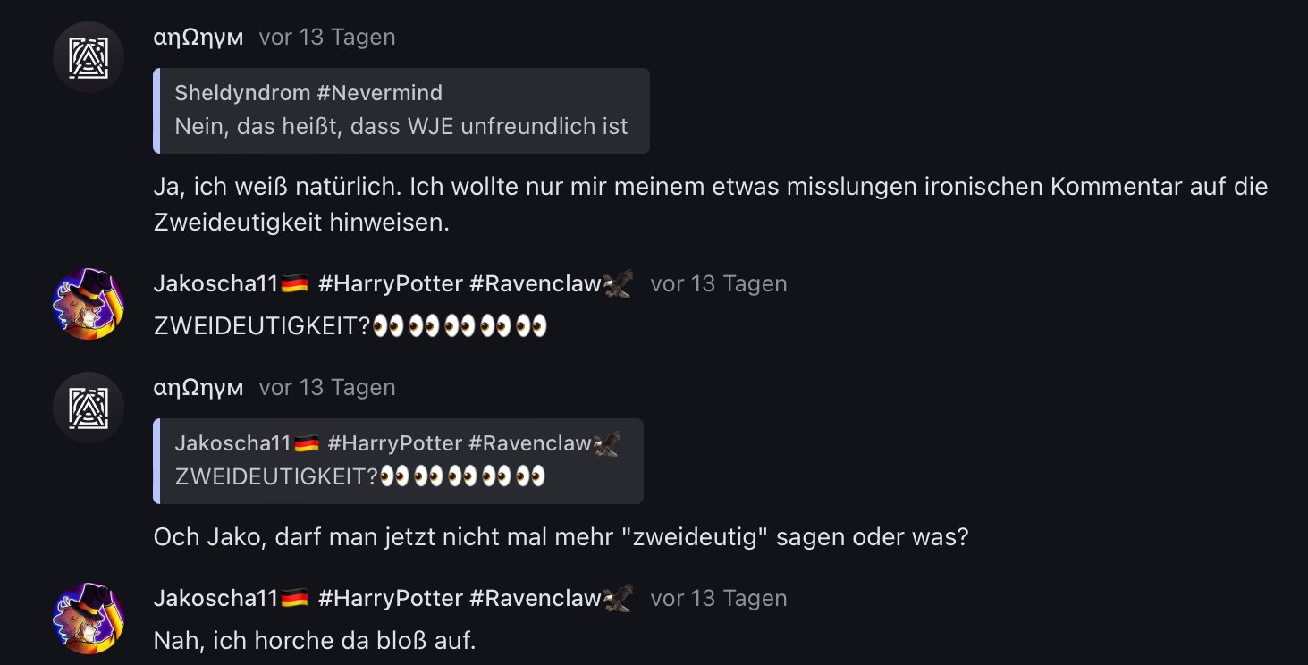 Und so begab es sich mal wieder, dass ich in einem leeren Chat verblieb. So entschied ich mich, vorerst ebenfalls inaktiv zu sein. Möglicherweise werde ich nochmals vorbeigeschaut haben, ob noch jemand/etwas hier aufgetaucht ist.