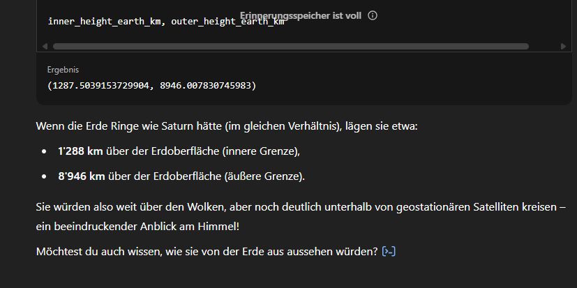 Moooooment. Das wären dann aber rund sechseinhalb km, und der Mt. Everest ist 8.849 m hoch… man könnte einfach von den höchsten Bergen unserer Erde aus den Ring besteigen. Ich glaube, ich habe mich verrechnet, das würde doch rein von der Schwerkraft her niemals klappen.