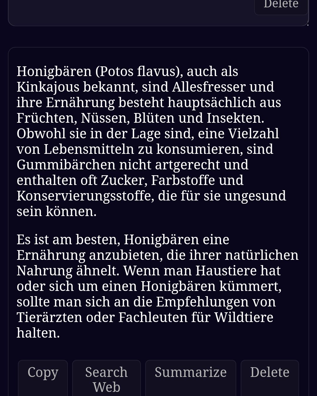 Du hast recht, Honigbären dürfen gar keine Gummibärchen fressen! In einigen Videos von der Tierpflegerin hat sie die Tiere mit Sahne gefüttert und in anderen Videos erwähnt, dass sie laktoseintolerant sind und daher keine Sahne fressen oder Milch trinken können. Also ist die Frau gar keine Expertin und tut auch nichts Gutes für diese Tiere. Schade, dass ich es vorher nicht gewusst habe! Danke für die Infos!