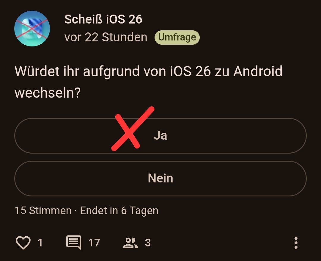 Scheiß iOS 26vor 1 MonatScheiß iOS 26Wer Android bereits nutzt, bitte Ja ankreuzen!Ergänzung: Ankreuzen = Auswählen