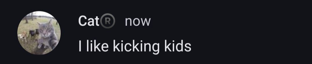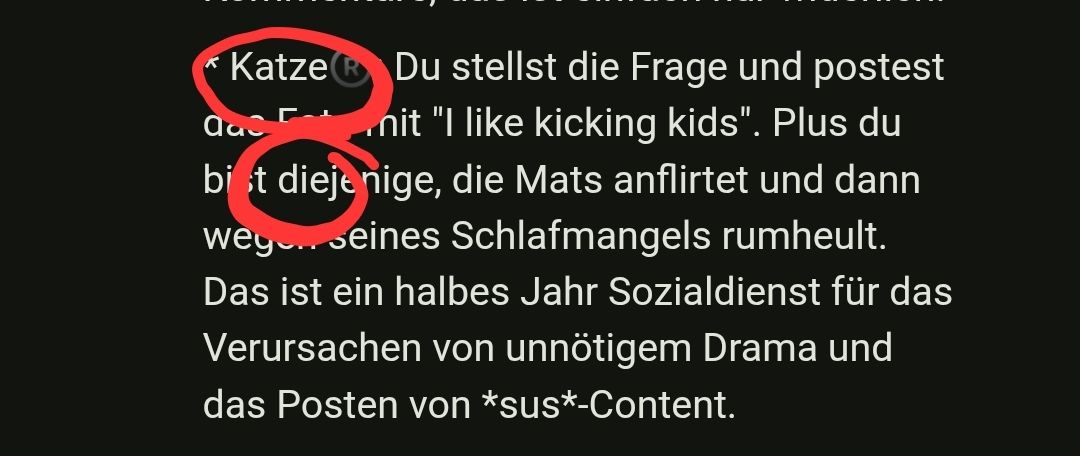 * Katze®️: Du stellst die Frage und postest das Foto mit "I like kicking kids". Plus du bist diejenige, die Mats anflirtet und dann wegen seines Schlafmangels rumheult. Das ist ein halbes Jahr Sozialdienst für das Verursachen von unnötigem Drama und das Posten von *sus*-Content.