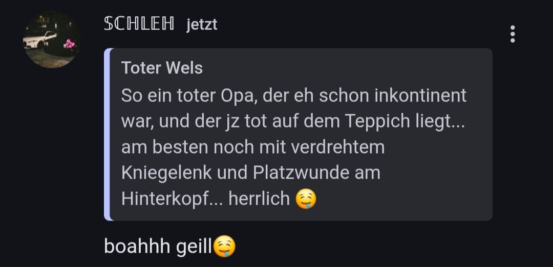 So ein toter Opa, der eh schon inkontinent war, und der jz tot auf dem Teppich liegt... am besten noch mit verdrehtem Kniegelenk und Platzwunde am Hinterkopf... herrlich 🤤