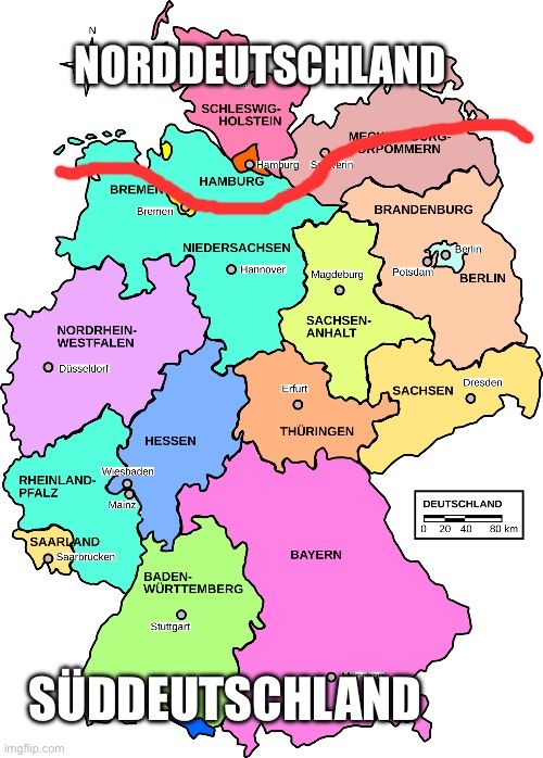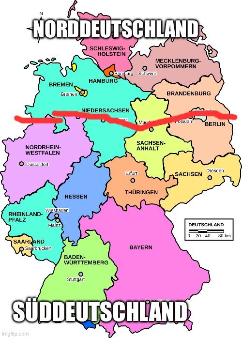 Hessen, Thüringen, Saarland, Sachsen und Sachsen-Anhalt sind niemals Süddeutschland 🙏🏻 Saarland maybe noch, aber wenn es nur Nord und Süd sein soll, ohne Mittel, dann gehören Sachsen-Anhalt, NRW, Brandenburg und Berlin sowas von noch zu Norddeutschland (in meinen Augen)