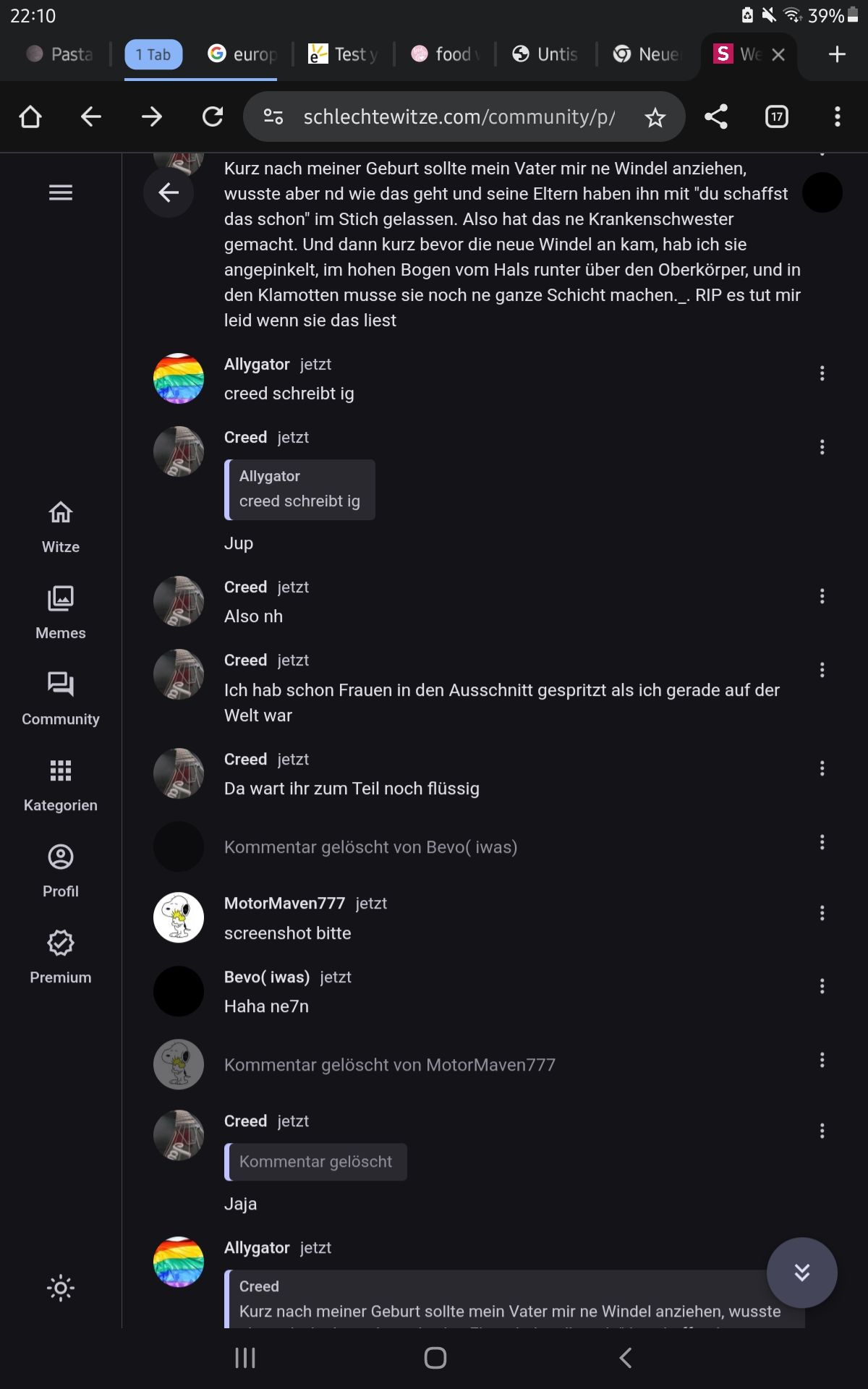 Kurz nach meiner Geburt sollte mein Vater mir ne Windel anziehen, wusste aber nd wie das geht und seine Eltern haben ihn mit "du schaffst das schon" im Stich gelassen. Also hat das ne Krankenschwester gemacht. Und dann kurz bevor die neue Windel an kam, hab ich sie angepinkelt, im hohen Bogen vom Hals runter über den Oberkörper, und in den Klamotten musse sie noch ne ganze Schicht machen._. RIP es tut mir leid wenn sie das liest