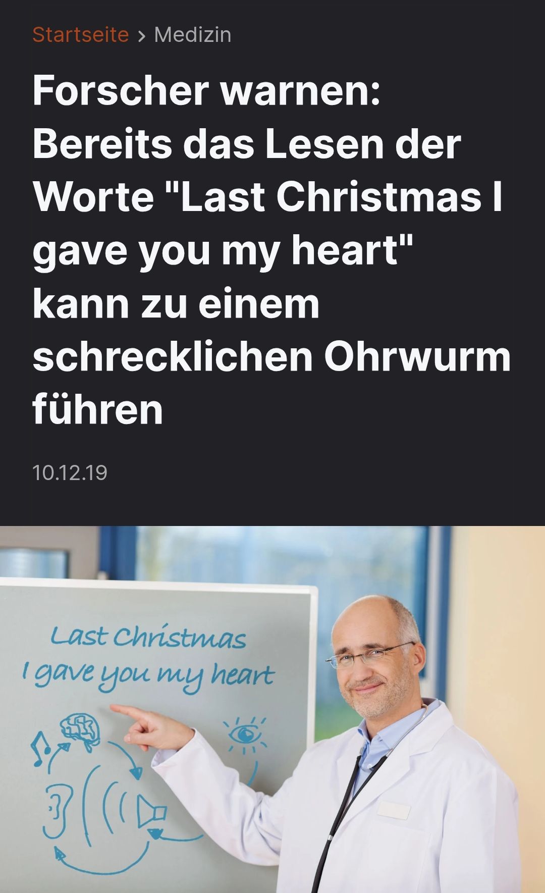 "Noch gefährlicher werde es, wenn man beim Lesen das 'a' im Wort 'Last' in Gedanken ein wenig in die Länge zieht ('Laaast Christmas I gave you my heart'). 'Dadurch erhöht sich die Ohrwurmwahrscheinlichkeit um weitere 700 Prozent', so Dr. Freestyler. 'Auch ein wiederholtes Lesen des Satzes 'Last Christmas I gave you my heart' erhöht das Risiko signifikant. Man sollte 'Last Christmas I gave you my heart' also so selten wie möglich lesen.'"