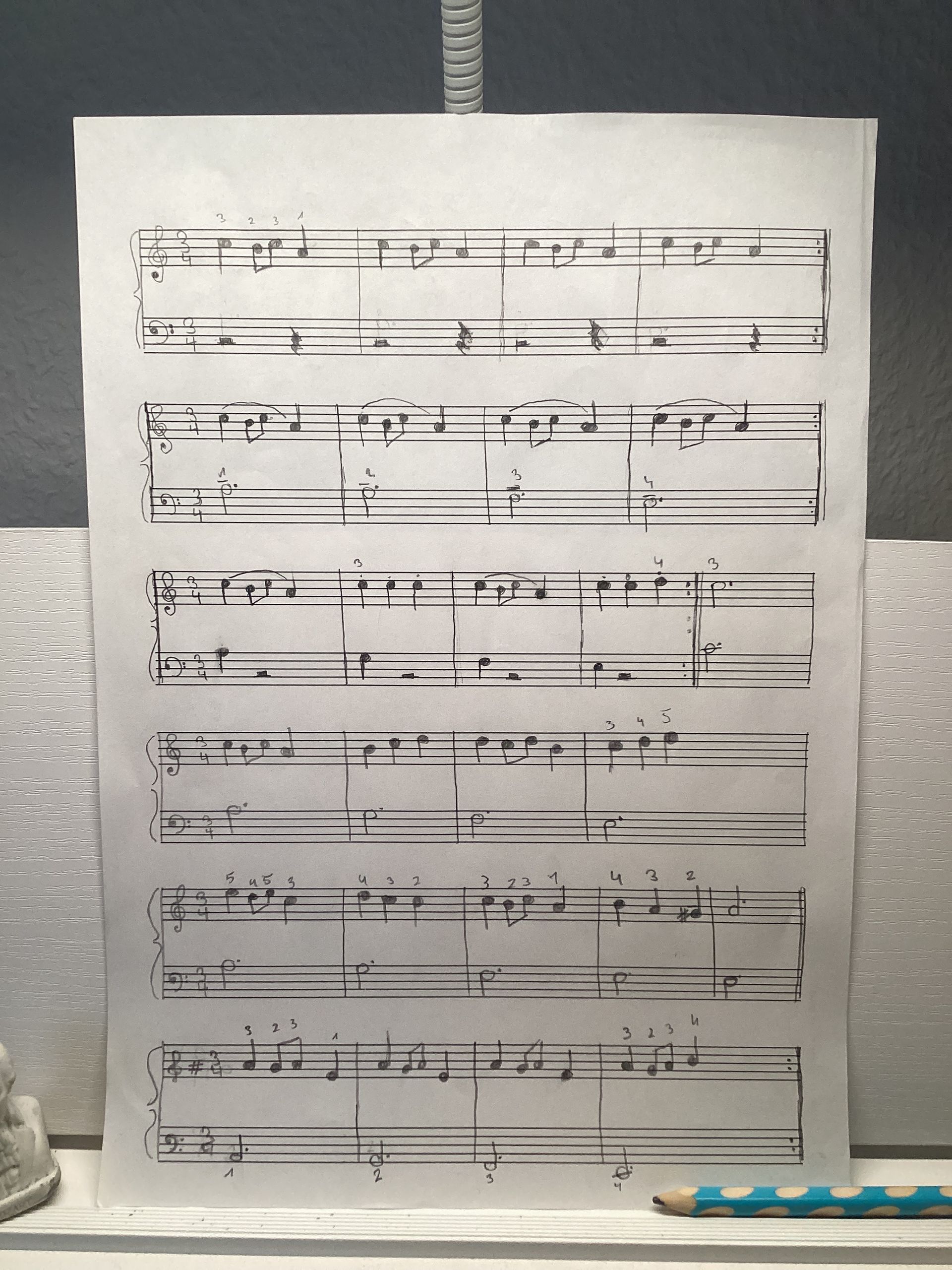 Fröhliche Weihnachten Leute! Aufgrund des typischen Stresses dieser Zeit, habe ich es leider nicht geschafft die Texte in die Noten zu kopieren, aber ich hoffe, ihr seid alle fähig zu lesen! Jedenfalls präsentieren wir nun unseren Weihnachtssong [Text hier, Noten im Beitrag]: | 1. Vorspiel 2. Singet | dem Herren | Jubel- | lieder 3. Denn | Christus ist | gebor'n in | Betlehem || Die 4. Engel | halten Wacht | während | Christus in | 5. seiner | Krippe ruht | so ruhig | in Beth- le- | hem 6. Singet | dem Herren | Jubel- | lieder 7. Christus | dem | Herren | *letzten 2 Takte nur Instrumentalisten*