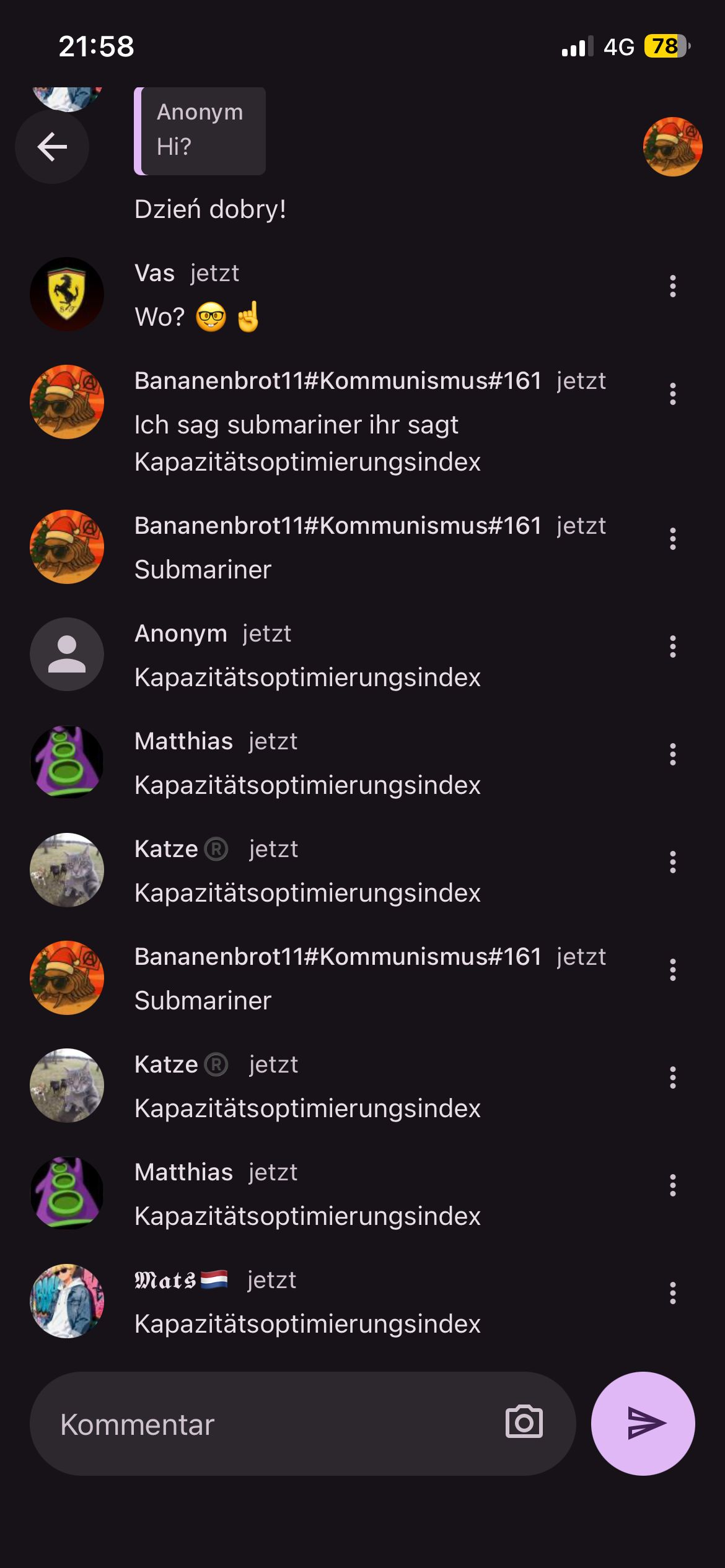 Der Chat war voller Chaos, wie immer. Erst haben sich alle gestritten, ob Monster oder Red Bull besser ist (natürlich Red Bull, ist doch klar). Dann gab es viel Drama: Jemand hat sich über einen miesen Freund, einen schrecklichen Vater und übergriffige Nachrichten auf Reddit beschwert. Zum Schluss ist der Chat komplett eskaliert, alle haben sich gegenseitig als Bots bezeichnet und sich über "Therians" lustig gemacht. Kurz gesagt: Ein Haufen Nonsens. Verschwende deine Zeit nicht damit.