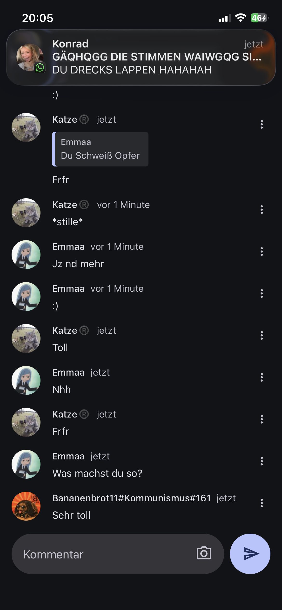 Ich hab da so nh Screenshot wie du etwas in einer WhatsApp Gruppe sagst..