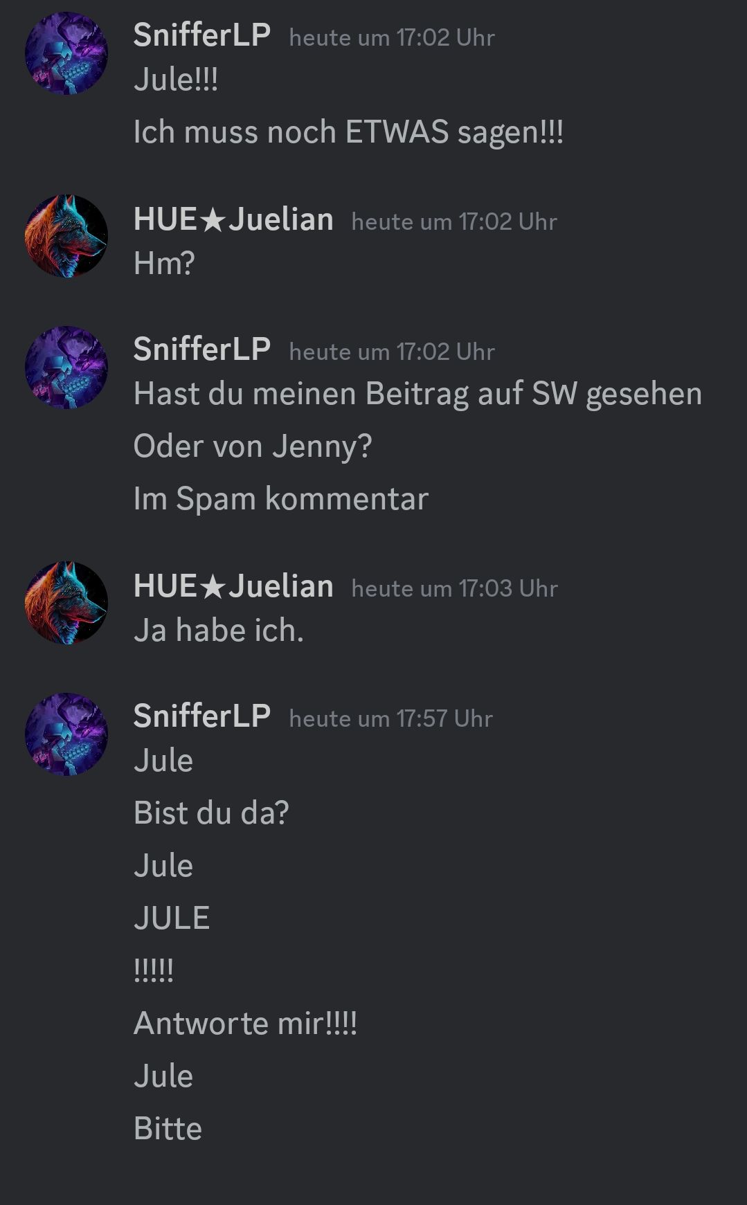 gut, dann klären wir es ruhig. Nik, könntest du bitte aufhören zu behaupten, jule mache das alles nur wegen aufmerksamkeit?