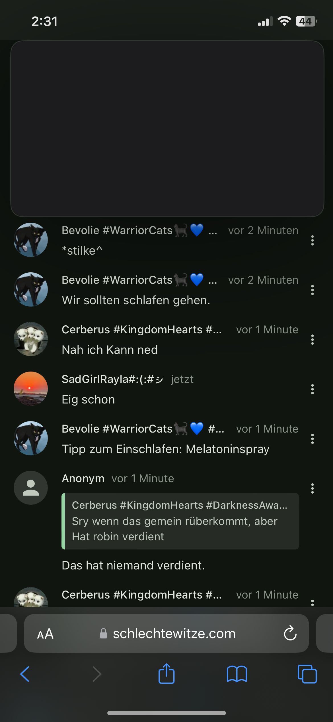 Herzlich Wilkommen auf SW^^ Bei Fragen kannst du dich gerne an die anderen und mich wenden. Was du beachten solltest, ist ganz simple und selbstverständlich, hoffe ich zumindest: - nicht spammen - nicht beleidigen - nicht faken - nicht nach Followern betteln - nicht mehr als 3 Beiträge, Witze und Memes pro Tag veröffentlichen - lösche deine eigenen Beiträge nicht, wenn dort bereits gechattet wurde oder wird, um neue machen zu können - erstelle keine neuen Chat-Beiträge, wenn es noch welche gibt, die gefüllt werden können.