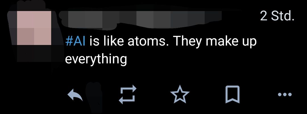 Alles besteht aus Atomen, daher bilden Atome alles ("atoms make up everything"). KI erfindet gerne Informationen ("AI makes up everything"). Daher das Wortspiel.