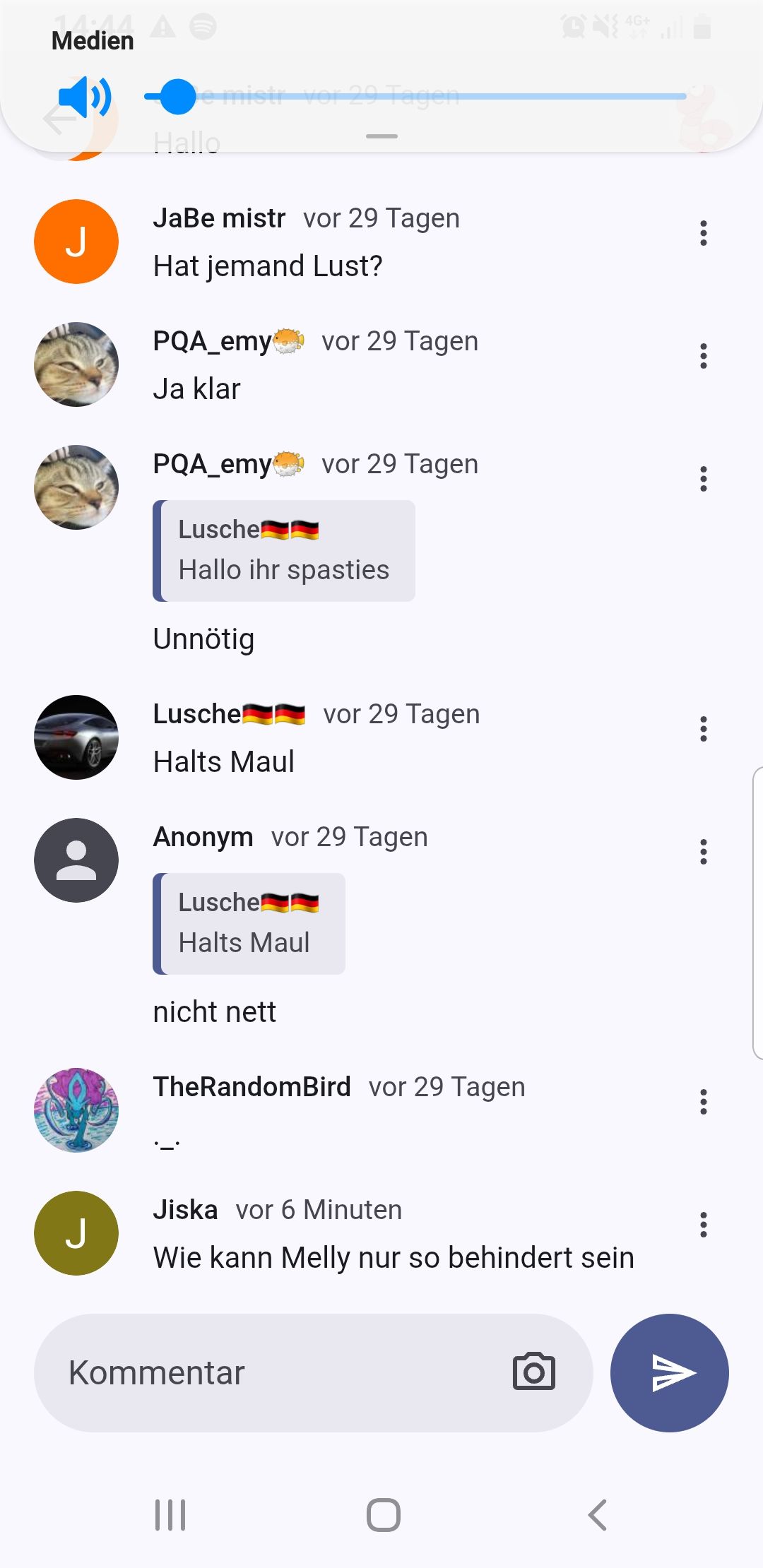 Leck ei XD? Was ist das für ein bescheuerter Quatsch, du Flachzange! Hab ich dir erlaubt, so einen Nonsens von dir zu geben? Ich hab keine Zeit für dein sinnloses Gelaber. Wenn du nichts Schlaues zu sagen hast, halt die Klappe!