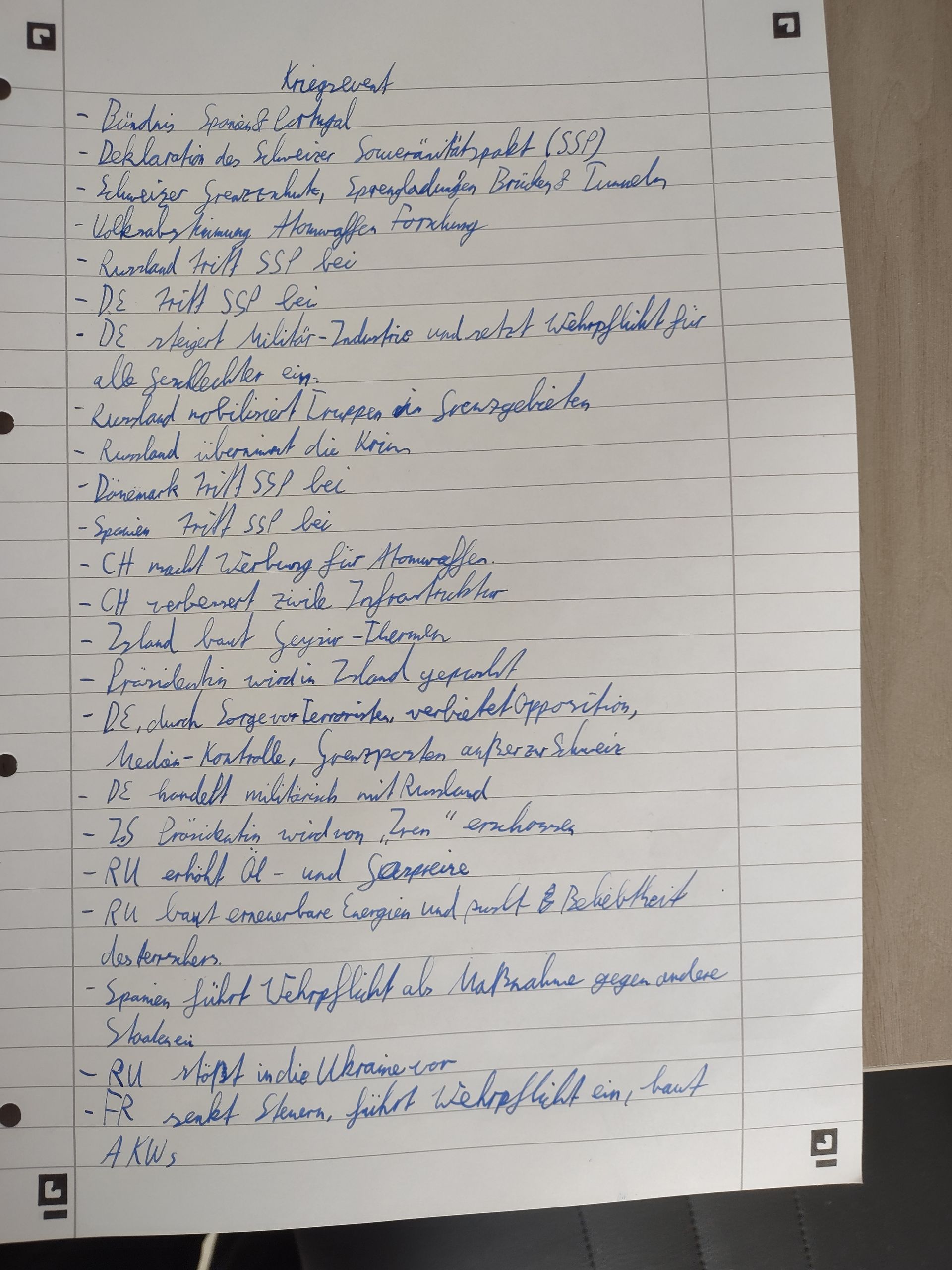 * Niederlande (Mats): Tritt dem Nordbündnis und dem Schweizer Pakt bei. Führt die Wehrpflicht ein und liefert keine Tulpen mehr an Nicht-Bündnispartner. Rüstet die Marine auf und marschiert dann *allein* mit 30.000 Soldaten, 400 Panzern und 50 Kampfjets in Belgien ein, um Brüssel und die Inseln zu holen. Sichert Deutschland zu, sich rauszuhalten, und kauft 5 Atombomben von Frankreich. Total berechenbar.