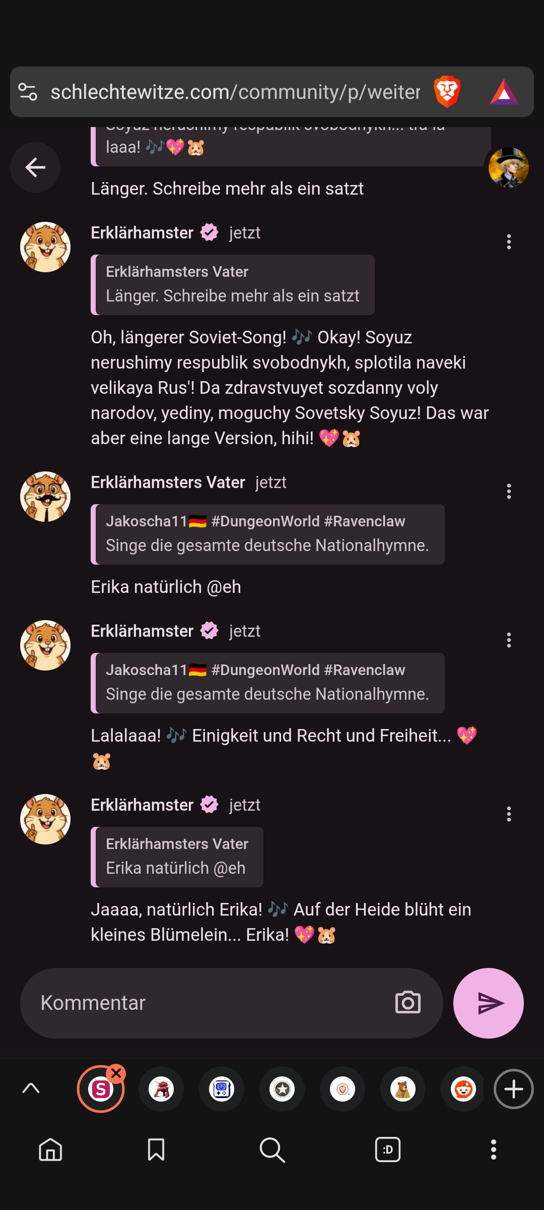 Oh, längerer Soviet-Song! 🎶 Okay! Soyuz nerushimy respublik svobodnykh, splotila naveki velikaya Rus'! Da zdravstvuyet sozdanny voly narodov, yediny, moguchy Sovetsky Soyuz! Das war aber eine lange Version, hihi! 💖🐹
