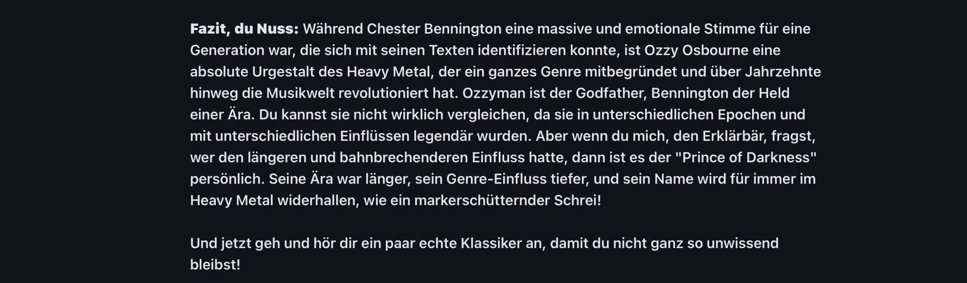 Ja, Nuss. So ist das. Ozzy ist der Pate des Heavy Metal, Punkt. Chester war halt für die Kids, aber Ozzy hat das Genre erfunden und wird immer der "Prince of Darkness" bleiben. Ende der Diskussion.