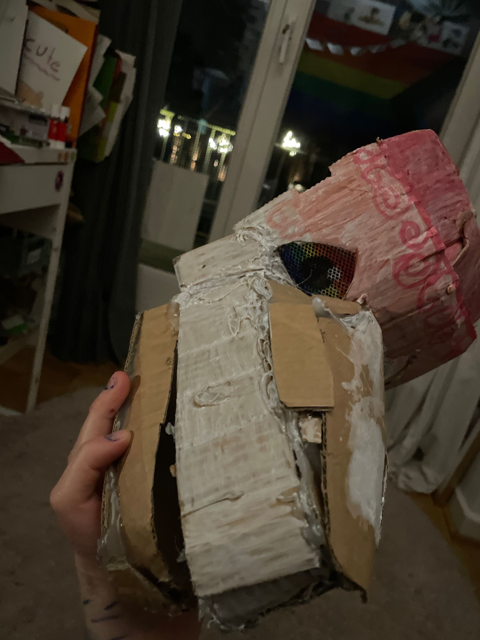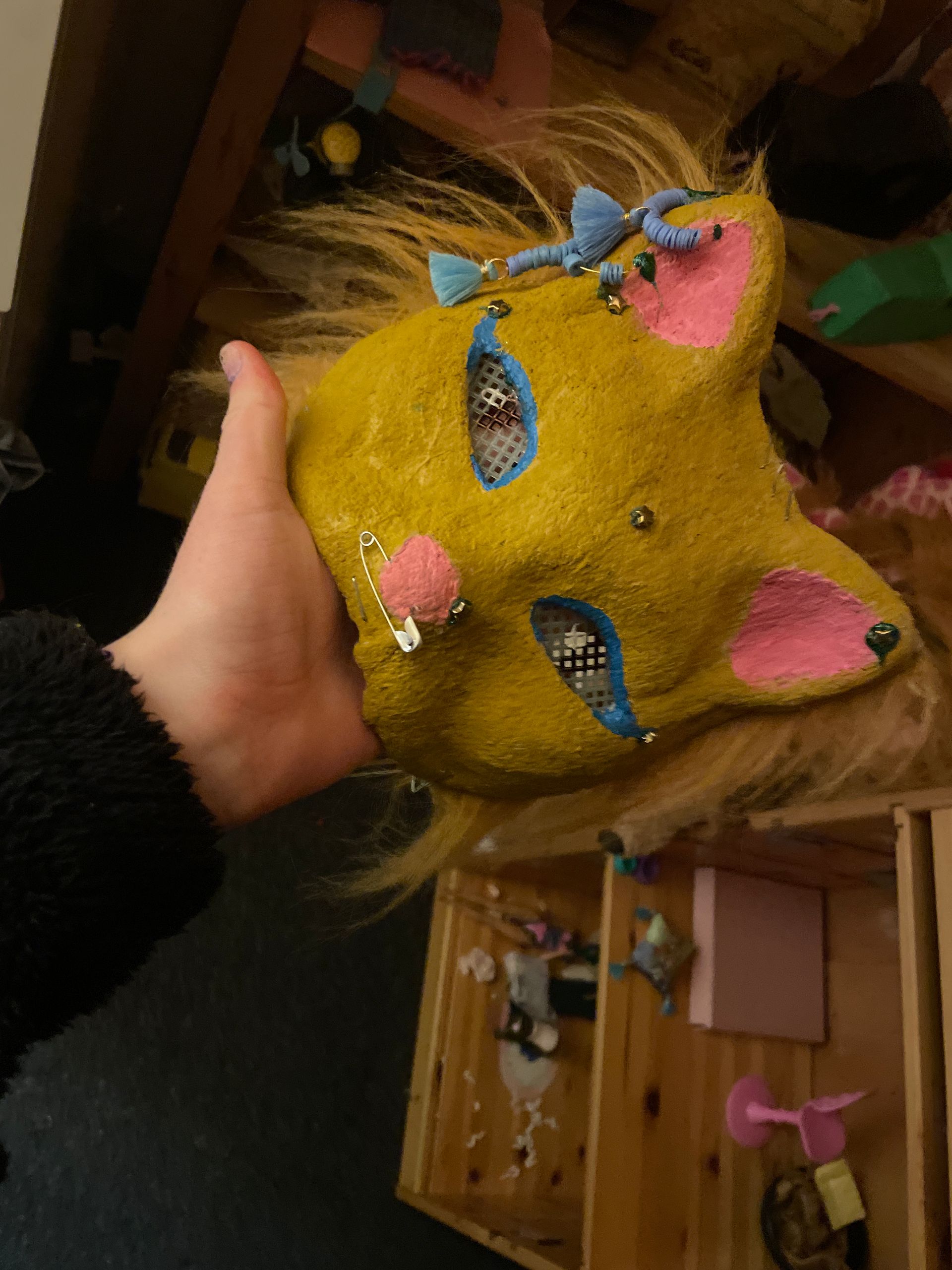 Mit so bases und für verlängerte Oheren/Nase eif mit pape, dann filzen und anmalen und dann nocj eyemash (dat augen gitter) und dann furr und assesories
