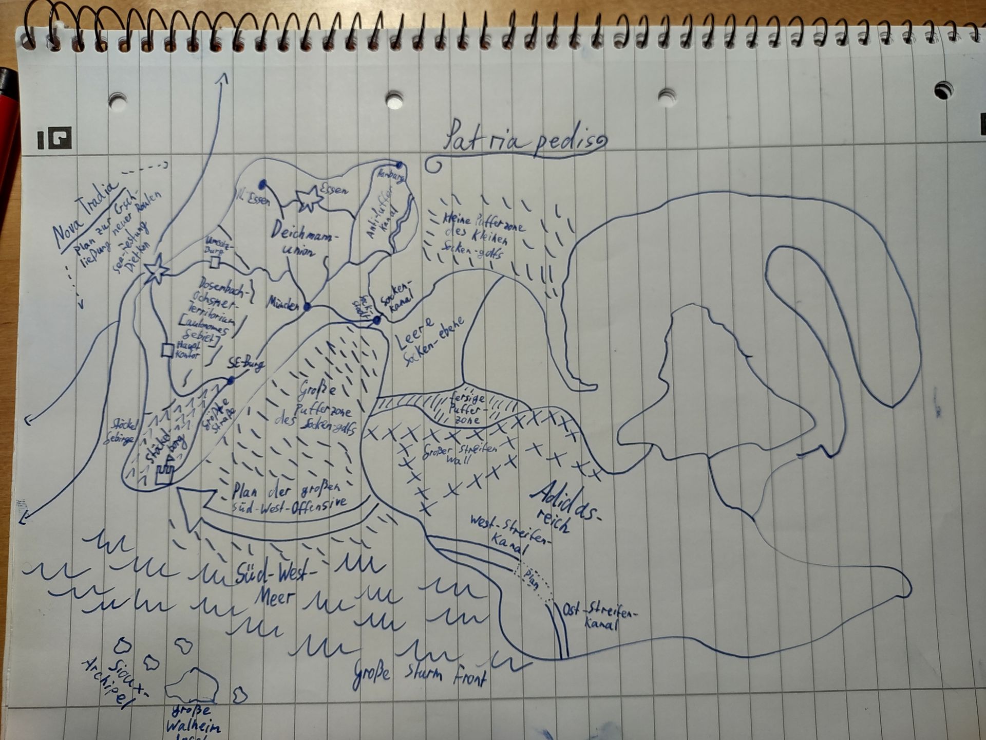 A Landkarte zeichnen vom "Adidas-Reich" im Heft, a kommunistisches Känguru in Zuckerguss g'flecht.