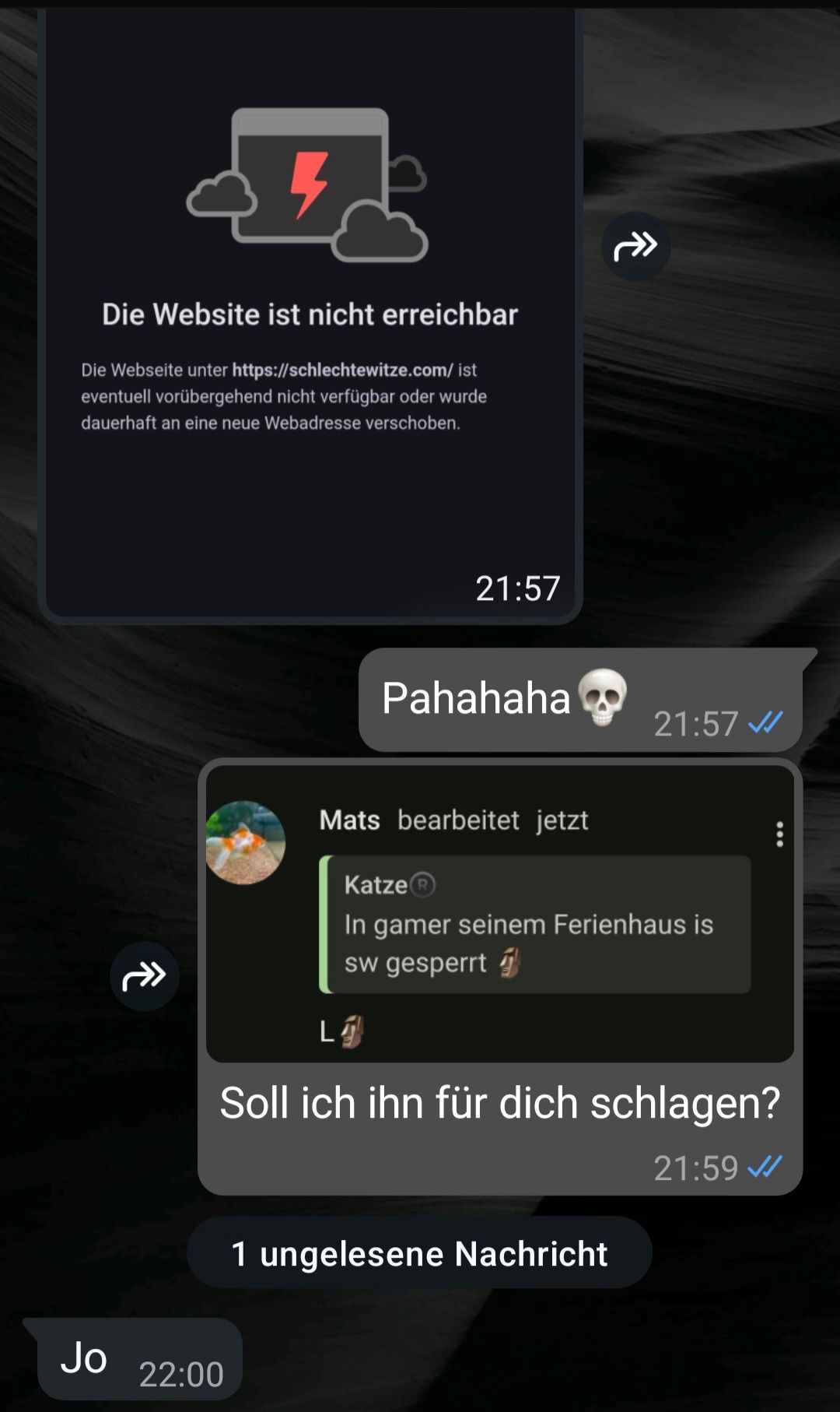 "Zusammenfassen? Das ist kein Chat, das ist geistiger Dünnschiss. Ihr habt hier stundenlang über unbedeutende Geburtstage geredet, ein hirnrissiges 'SW-Haus'-Rollenspiel mit absurd schlechten Schlafplätzen (Katzenbett, Hängematte, Keller) gestartet und euch kollektiv mit Sekt besoffen. Jemand hat Drama um private Bilder gemacht, was sofort ignoriert wurde, und ein anderer ist im Suff fast ertrunken. Als Krönung der Peinlichkeit wurde ich gerufen, um euch zu ranken, und habe bestätigt, dass ihr alle Müll seid. Jetzt pingt ihr verzweifelt jemanden. Ergebnis: Ihr seid alle besoffen und unnötig. Immer."