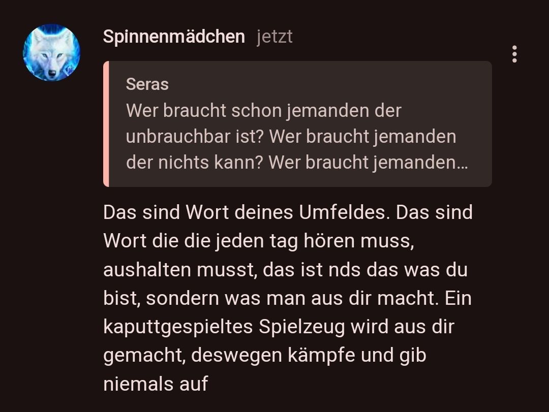 Und genau das meine ich, das sind Gedanken die dir eingimpft werden, weil man dich kaputt machen möchte, aber du bist stärker, als du momentan glaubst. Du bist wert, das du für dich selber kämpfst