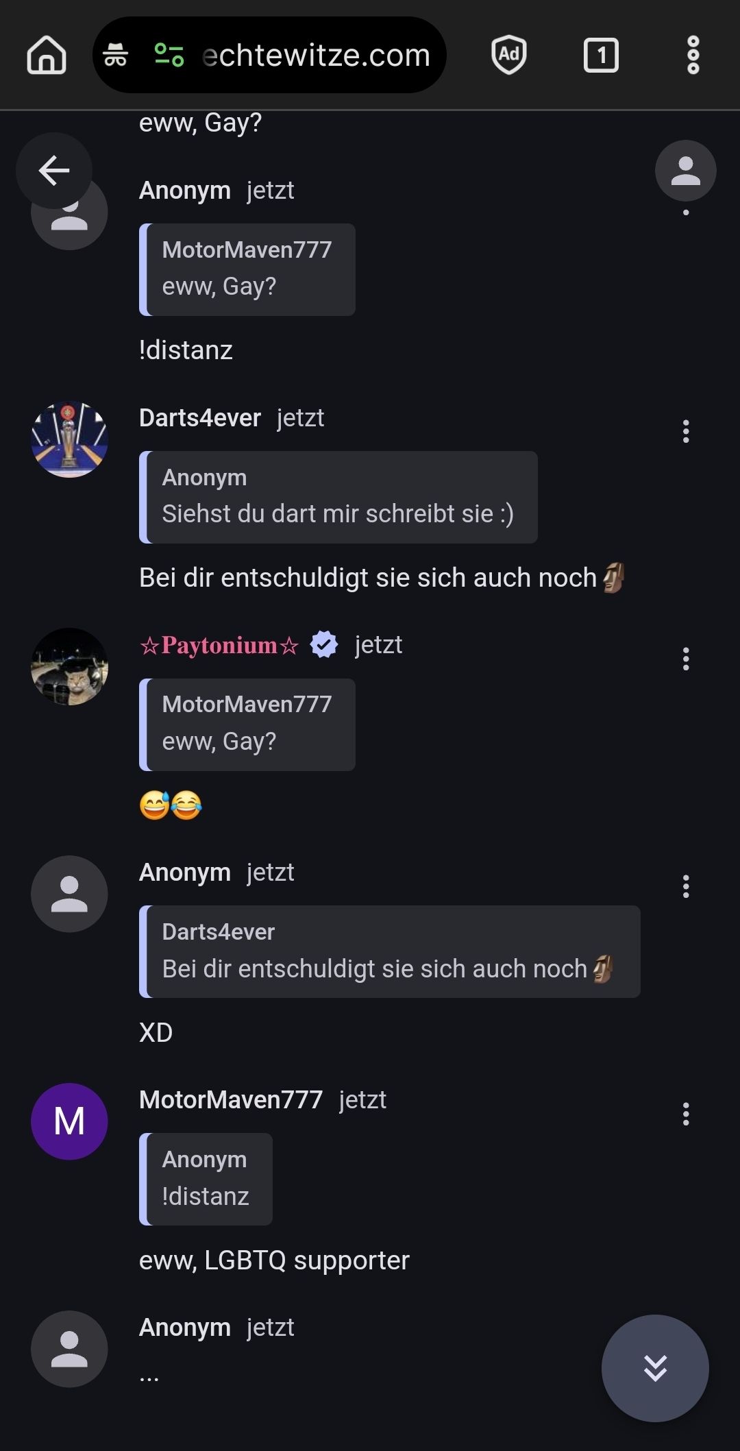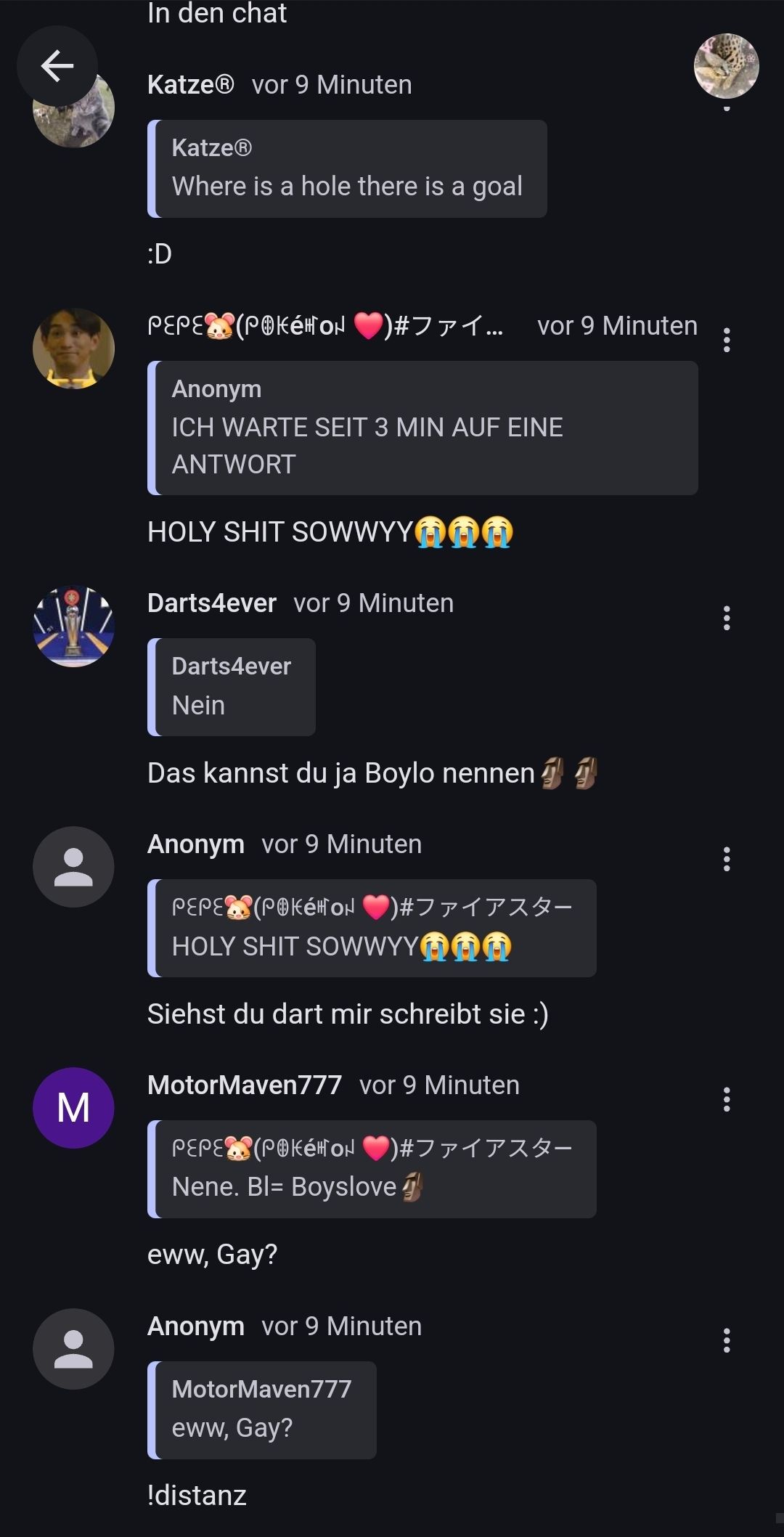 wenn es um meinungen geht ja, beleidgen usw maybe. aber i mean vielleicht is es auch so irl woe er sagt. ich verstecke das nicht gerade mit der ablehnung gegen lgbtq und kommunismus usw, maybe bin ich deswegen (freundschaftlich und familiär) si allein