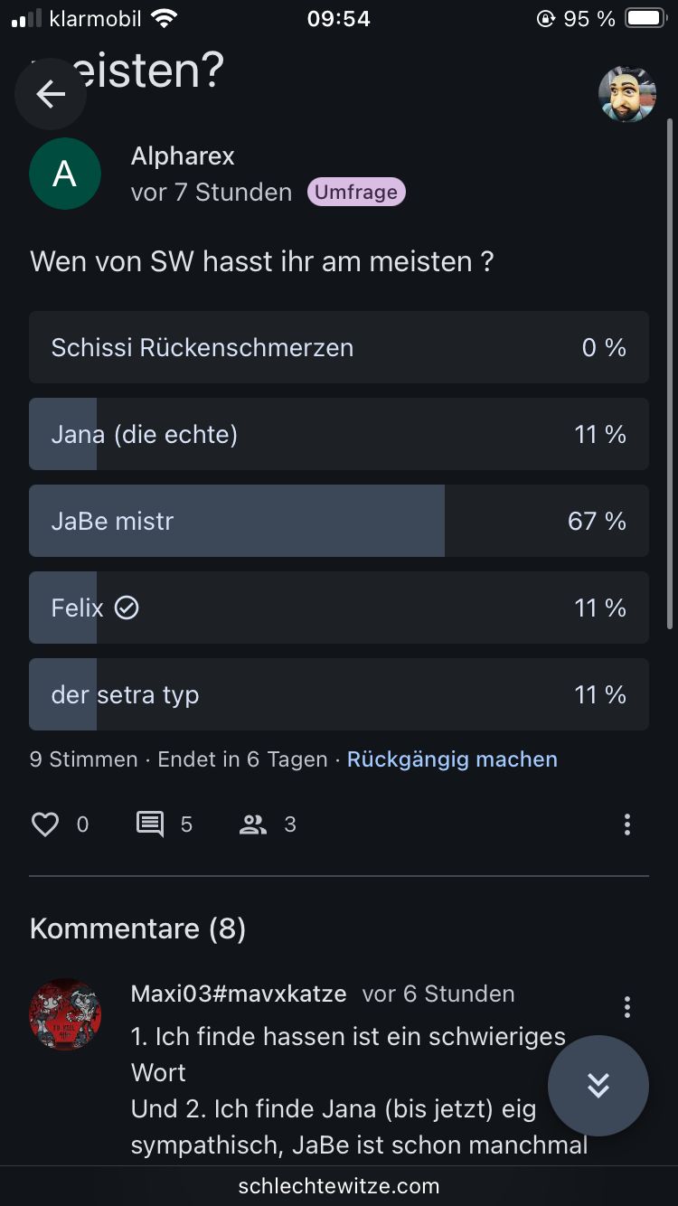 Bro ich hasse niemanden aber mich fuckt dieser typ am meisten ab der diese Umfragen macht, diese umfragen a lá „wer is lustiger“, „wer hat die besseren sprüche“ und sowas halt