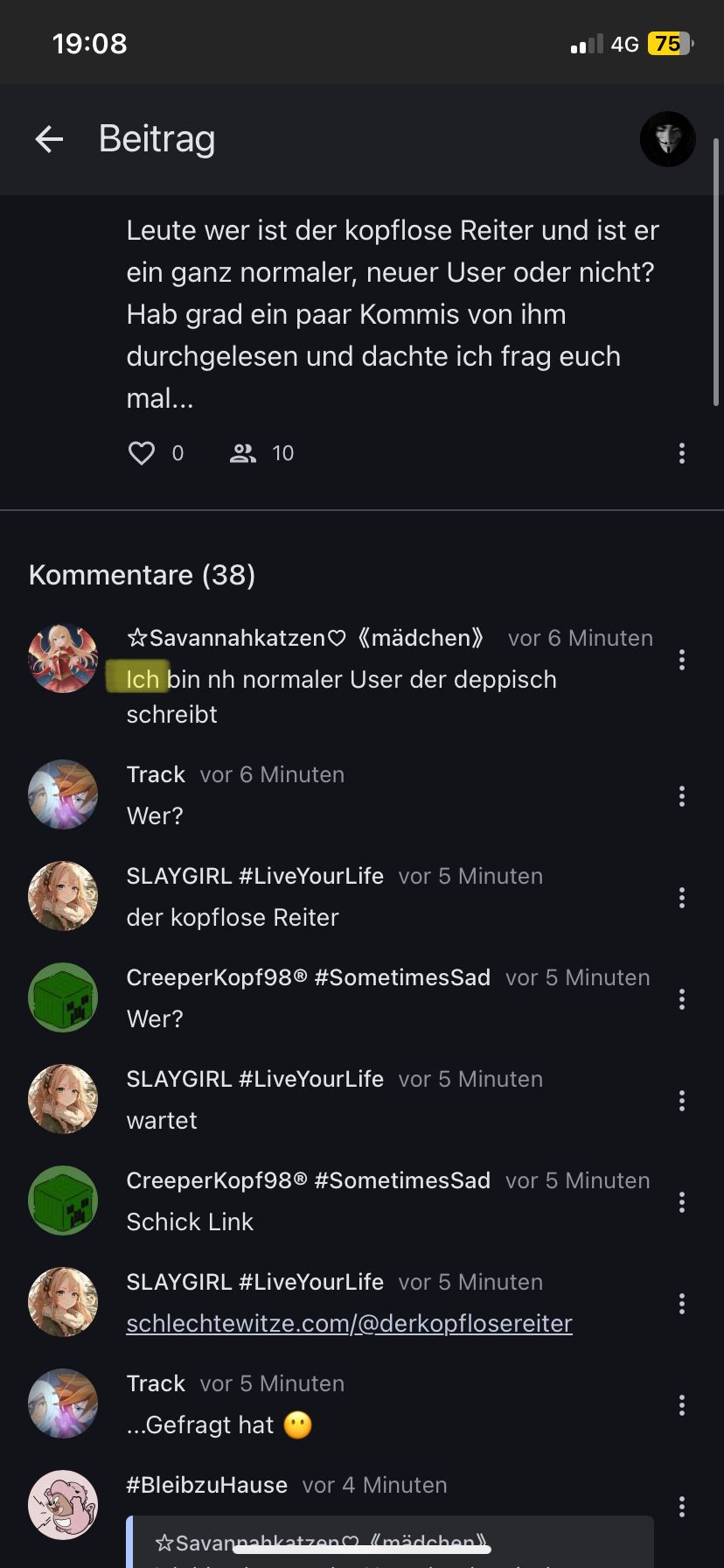 Checke ich gerade auch nicht, warum hat Savannahkatzen aber "Ich" geschrieben, während es im Beitrag um den kopflosen Reiter geht🥲