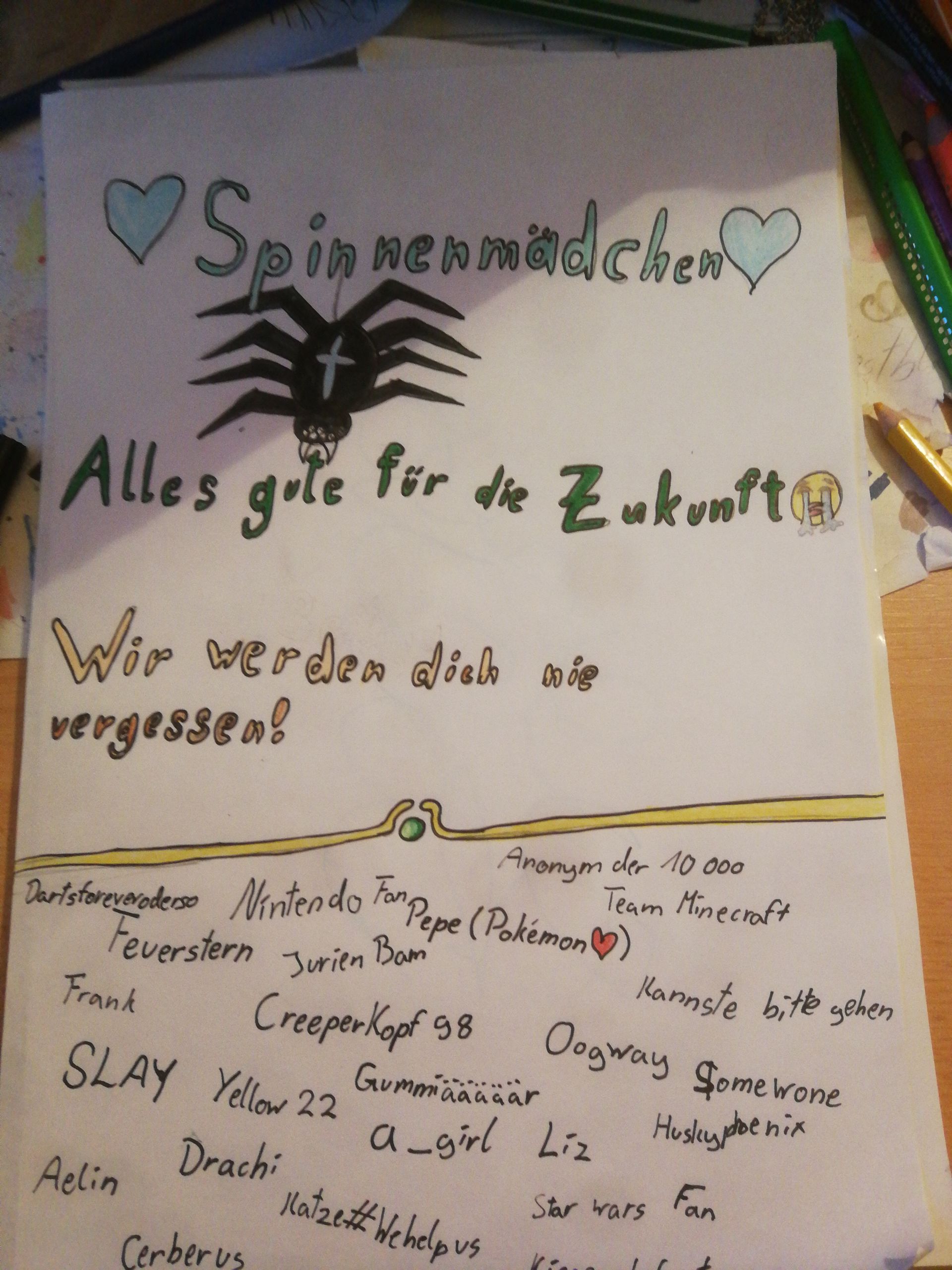 Kann mein Name auch noch drauf? Ich habe zwar fast nie mit ihr gechattet aber trotzdem ist es schade das sie geht.😔