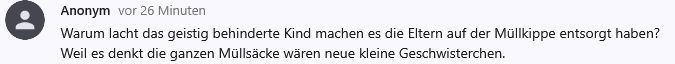 Das ist ein Witz mit einer Pointe. Anders als der Kram, den du erzählt hast. Was soll bitte lustig daran sein, wenn ein behindertes Kind als Missgeburt, Unrat und dergleichen bezeichnet wird? Oder wenn der gesamte Beitrag daraus besteht, dass ein solches Kind getötet oder ausgesetzt wird? Da sucht man den Humor vergeblich. Und Provokation um der Provokation willen ist ebenfalls noch kein Witz. Wäre das anders, könnte ich auch einfach "Vergewaltigung" oder "Hitler" schreiben und das als Witz verkaufen.