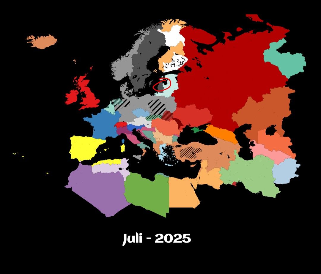 20. 5. 2025 Nach den Kriegen ist etwas Ruhe eingekehrt, Finnland blieb dank seiner bisherigen Neutralität verschont. Flüchtlinge, von denen viele nach Griechenland gingen, werden an Deutschland verkauft und helfen missmutig beim Wiederaufbau. Ägypten kauft 50 Taurus Raketen von Deutschland und beginnt mit dem Bau von Flüchtlingslagern. Gleichzeitig versucht die Türkei Griechenland zu annektieren. In Epirus und Thrakien funktioniert die Taktik an Versprechen, die restlichen Gebiete bleiben jedoch dem alten Herrscher treu. Iranistan schenkt an Deutschland 100 Raketen.