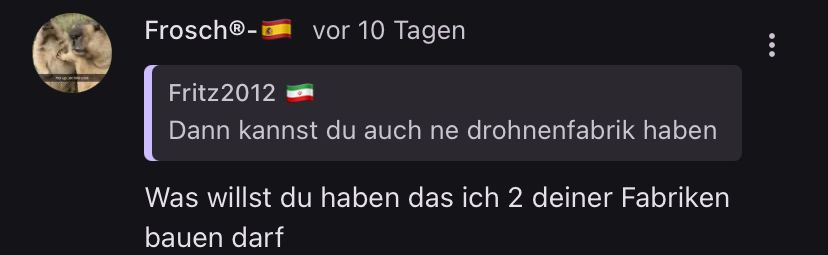 9. 6. 2025 Deutschland und Iranistan tauschen 20 Skyranger und 20 Leopard gegen 90 iranische Raketen. In Iranistan werden die Skyranger auf Truppentransporter gebaut um schnelle, wendige Flugabwehr zu besitzen. Gleichzeitig kauft Iranistan 400 SÄ WB25. Ägypten schickt 4 Kamikazedrohnen nach London. Jene können von Zerstörern und FLAK-Geschützen unter niedrigen Verlusten abgefangen werden. In Deutschland entsteht ein Werk für Fattah-1 und Chorramschahr Raketen. In Iran dafür ein Werk für GTX-Boxer. In Ägypten entsteht ein Werk für deutsche Fregatten und deutsche Panzer. In Spanien entstehen 2 Werke in Barcelona und Madrid für iranische Raketen. In Finnland werden Zivilisten bewaffnet.