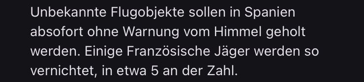 7. 5. 2025 Dänemark startet eine Bomberstaffel um Malta in Schutt und Asche zu zerlegen, ein kroatisches Zerstörergeschwader beginnt jedoch mit dem Beschuss der Bomberstaffel. Der Verlust dreier Kriegsschiffe nehmen die Kroaten in Kauf um das Bombergeschwader zu vernichten. Kroatien unterbreitet Deutschland folgendes Angebot: Weitere militärische Kooperation und Schutz für Malta, für die Inselgruppe der Fünnen. Sollte dies abgelehnt werden, ist Kroatien auch bereit, Deutschland die Stadt Zara zu Militärbasen Zwecken zu schenken, für oben genannte Bedingungen. Unbekannte Flugobjekte sollen in Spanien absofort ohne Warnung vom Himmel geholt werden. Einige Französische Jäger werden so vernichtet, in etwa 5 an der Zahl.