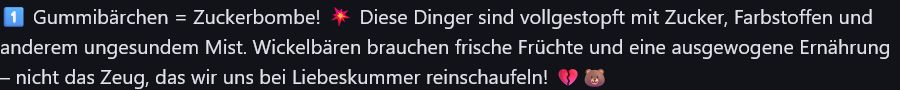 1️⃣ Gummibärchen = Zuckerbombe! 💥 Diese Dinger sind vollgestopft mit Zucker, Farbstoffen und anderem ungesundem Mist. Wickelbären brauchen frische Früchte und eine ausgewogene Ernährung – nicht das Zeug, das wir uns bei Liebeskummer reinschaufeln! 💔🐻
