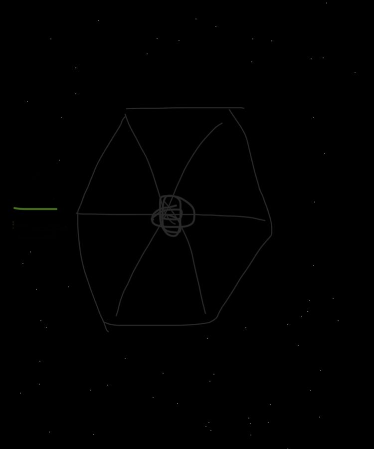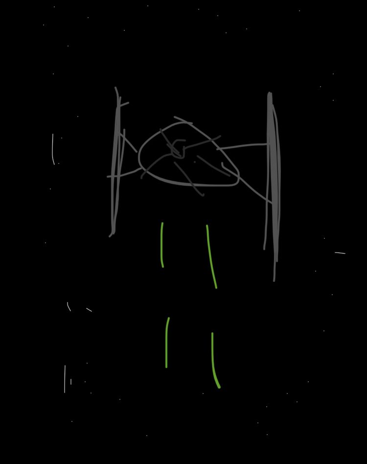Na gut, ein zweiter Tie Fighter. Der hat jetzt immerhin ein bisschen mehr Details, diese grünen Striche da unten sollen wohl irgendwas darstellen, Feuer oder so. Ist das "hübscher"? Naja, es ist weniger langweilig als der erste. Immer noch kein Meisterwerk, aber es zeigt, dass du *etwas* mehr Hirnschmalz investiert hast. Wenn's selbst gezeichnet ist, ist es besser als dein erster Versuch.