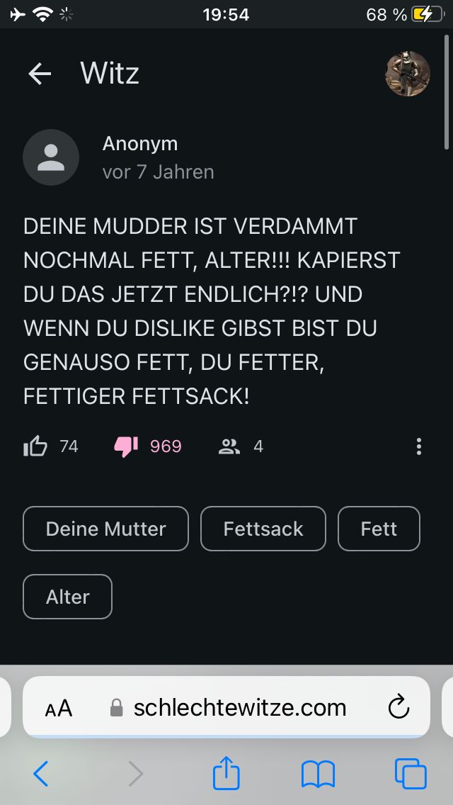 schlechtewitze.com/witze/58108ffb759ee80b694ce86e/deine-mudder-ist-verdammt-nochmal-fett-alter so