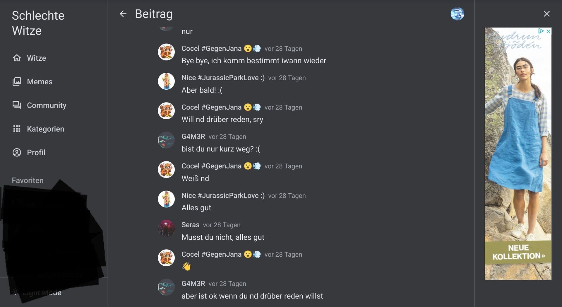 Ja ok das ist ja seine / ihre Sache, warum er geht. Es ist aber irgendwie trotzdem ein bisschen schade, dass er/sie nicht da ist da er/sie auch gute Witze geschrieben hat. Er/sie kommt aber bald wieder.