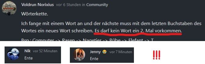Ich fange mit einem Wort an und der nächste muss mit dem letzten Buchstaben des Wortes ein neues Wort schreiben. Es darf kein Wort ein 2. Mal vorkommen.