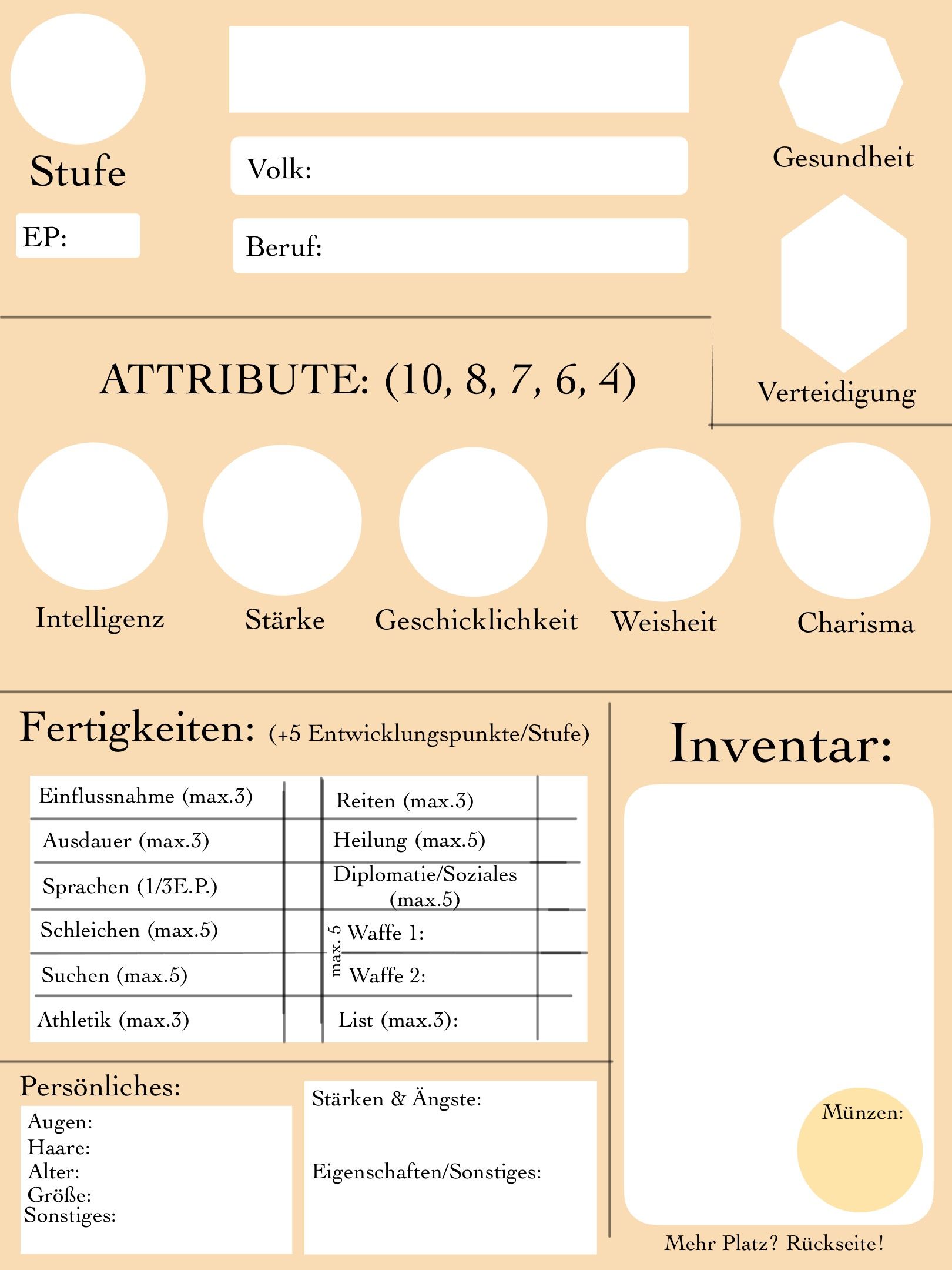 Puhhh... Also, es ist simpel gehalten, dass muss man dir lassen, aber ggf "Fertigkeiten" kürzen bzw weglassen? Keine Ahnung, was die halt erwarten bzw. was du denen versprochen hast, aber es ist simpel gehalten und verständlich. Ich würde mich wahrscheinlich auf Werte (die 6 standard) begrenzen und halt 1-3 extra Fähigkeiten für Rasse bzw Klasse usw. Aber, je nachdem, glaube ich, die sollten das auf jeden Fall gut aufgreifen können, wenn du es denen präsentierst. Wie lange hast du für eine Sitzung und wie oft und wie lange ist eine eig?