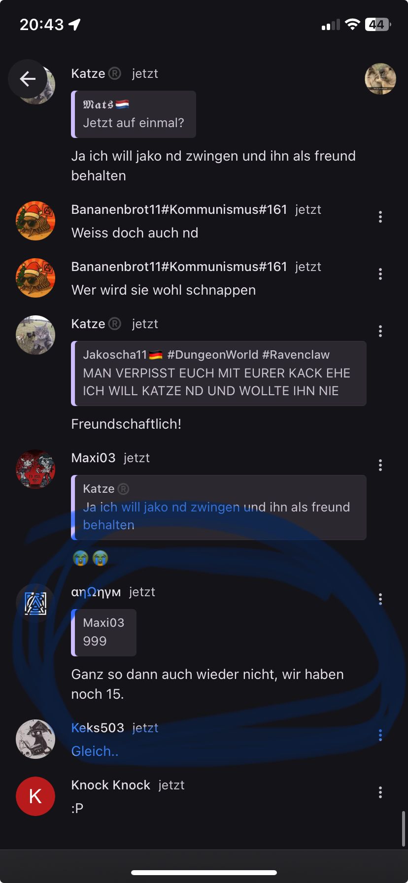 Also jetzt ohne mich zu weit aus dem Fenster lehnen zu wollen, würde ich mal ganz vorsichtig behaupten, dass es theoretisch denkbar wäre, dass das konkret von Hello Kitty ausgeht und der restliche Chat sowie Mädels im Allgemeinen damit rein gar nichts zu tun haben.
